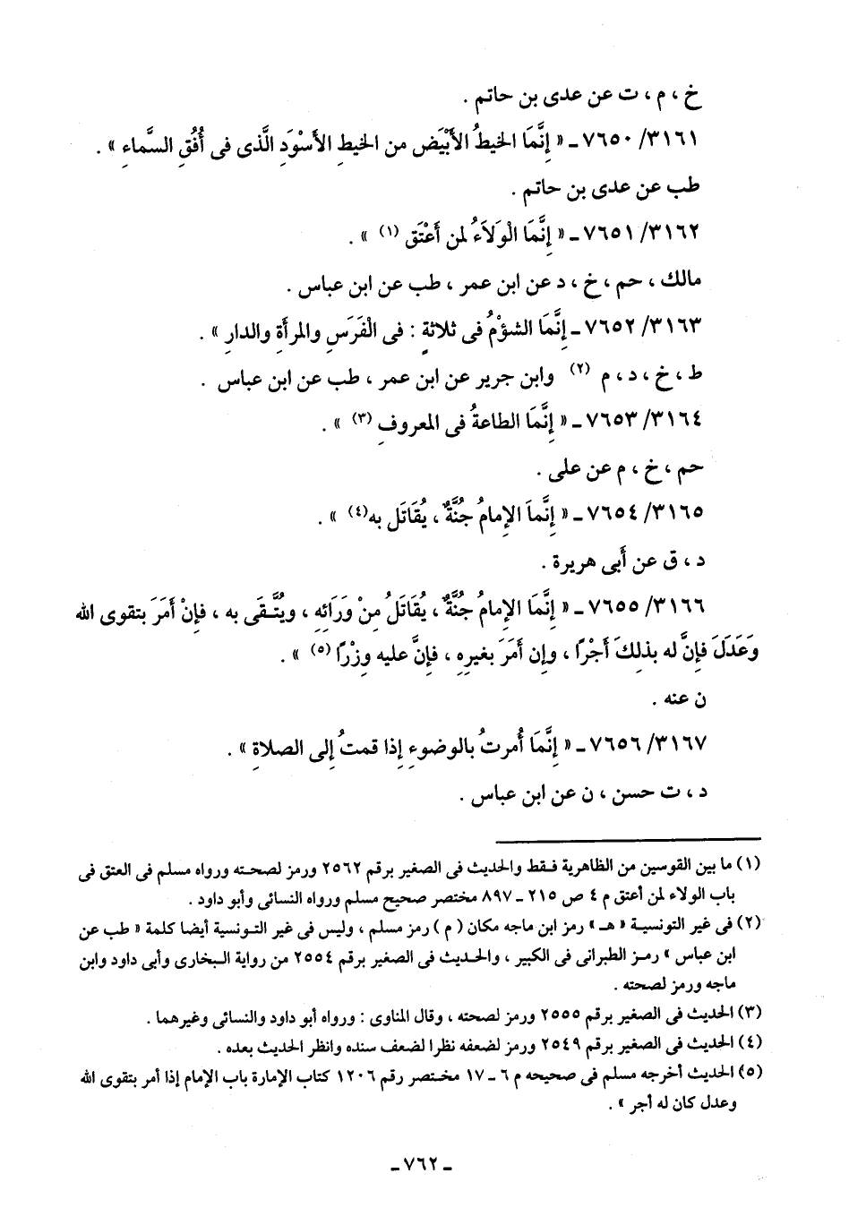 3166/ 7655 - "إِنَّمَا الإِمامُ جُنَّةٌ، يُقَاتَل مِنْ وَرَائِهِ، ويُتَّقَى به، فإِنْ أَمَرَ بتقوى اللَّه وَعَدَلَ فإِنَّ له بذلِكَ أَجْرًا، وإِنَّ أمَرَ بغيرِهِ، فإِنَّ عليه وِزْرًا (¬5) ".