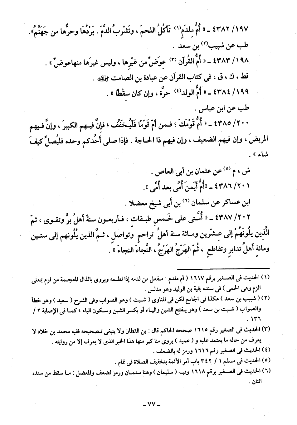 197/ 4382 - "أُمُّ مِلدَمٍ (¬1) تأكلُ اللحمَ، وتَشْربُ الدَّمَ. بَرْدُهَا وحرُّهُا من جَهَنَّمُ".