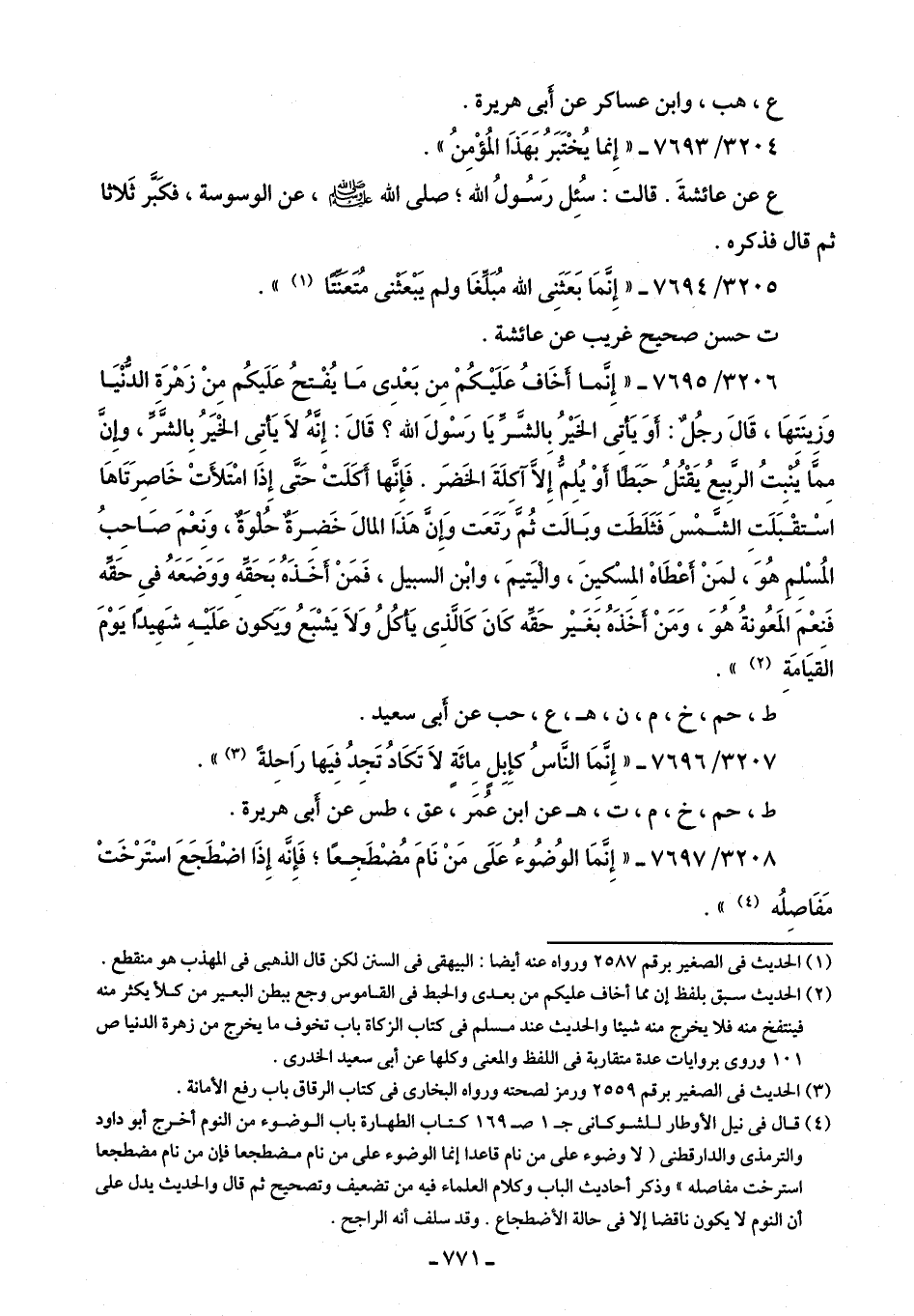 3206/ 7695 - "إِنَّما أخَافُ عَلَيْكُمْ مِن بَعْدِى مَا يُفْتحُ عَلَيكُم مِنْ زَهْرَة الدُّنْيَا وَزِينَنِهَا، قَالَ رجُلٌ: أَوَ يَأتِى الخَيْرُ بِالشَّر يَا رَسْولَ اللَّه؟ قَالَ: إِنَّهُ لَا يَأتِى الخْيَرُ بِالشَّرِّ، وإِنَّ مِمَّا يُنْبِتُ الرَّبِيعُ يَقْتُلُ حَبَطًا أوْ يُلِمُّ إِلَّا آكلَةَ الخَضَر. فَإِنَّها أَكَلَتْ حَتَّى إِذَا امْتَلأَتْ خَاصِرَتَاهَا اسْتقْبَلَتِ الشَّمْسَ فَثَلَطَت وبَالَت ثُمَّ رَتَعَت وَإنَّ هَذَا المالَ خَضِرَةٌ حُلْوَةٌ، وَنِعْمَ صَاحِبُ المُسْلِم هُوَ، لِمَنْ أعْطَاهْ المِسكيِنَ، والْيَتيمَ، وابْن السبيل، فَمَنْ أخَذَهُ بَحَقَهِ وَوَضَعَهُ فِى حَقِّه فَنعْمَ المَعُونةُ هُوَ، وَمَنْ أخَذَهُ بَغَيْر حَقَه كَانَ كَالَّذِى جملُ وَلَا يَشْبَعُ وَيَكون عَلَيْهِ شَهِيدًا يَوْمَ الَقيَامَة (¬2) ".