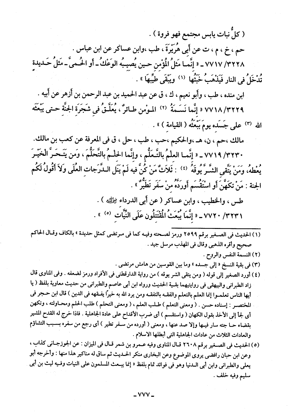 3229/ 7718 - "إِنَّما نَسَمَةُ (¬2) المؤمن طائرٌ، يُعَلقُ فِى شَجَرَةِ الجنَّةِ حتى يَبْعَثَه اللَّه (¬3) على جَسَدِه يومَ بَبْعَثُه (القيامةِ) ".