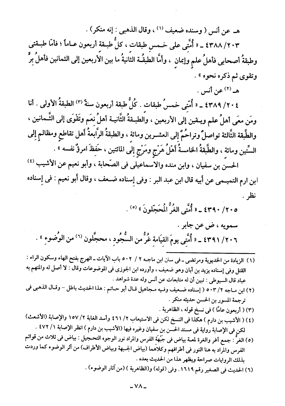203/ 4388 - "أُمَّتي على خمسِ طبقات، كلُّ طبقة أربعون عامًا؛ فأمّا طبقتى وطبقةُ أصحابى فأهلُ علم وإيمانٍ، وأَمَّا الطبقةُ الثانيةُ ما بين الأربعين إلى الثمانين فأهلُ بِرٍّ وتقوى ثم ذكره نحوه".