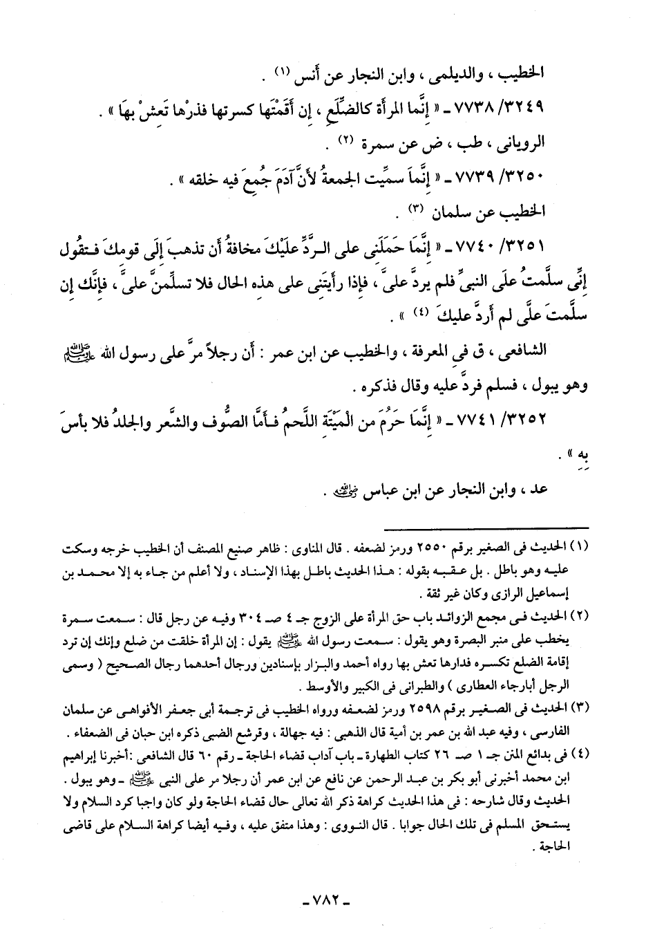3251/ 7740 - "إِنَّمَا حَمَلَنِى على الرَّدِّ علَيْكَ مخافةُ أن تذهبَ إِلَى قومكَ فتقُول إِنِّى سلَّمتُ علَى النبىِّ فلم يردَّ علىَّ، فإذا رأيتَنِى على هذه الحال فلا تسلِّمنَّ علىَّ، فإنَّك إِنَّ سلَّمتَ على لم أردَّ عليكَ (¬4) ".
