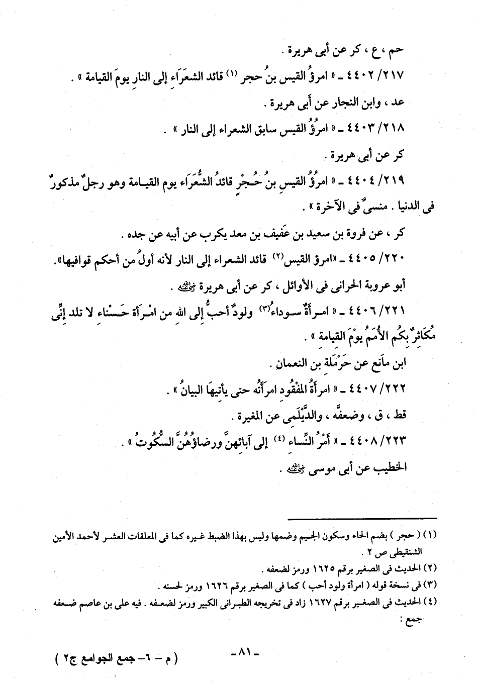 219/ 4404 - "امرُؤُ القيسِ بن حُجْرٍ قائدُ الشُّعَرَاء يوم القيامة وهو رجل مذكورٌ في الدنيا. منسيٌّ في الآخرة".