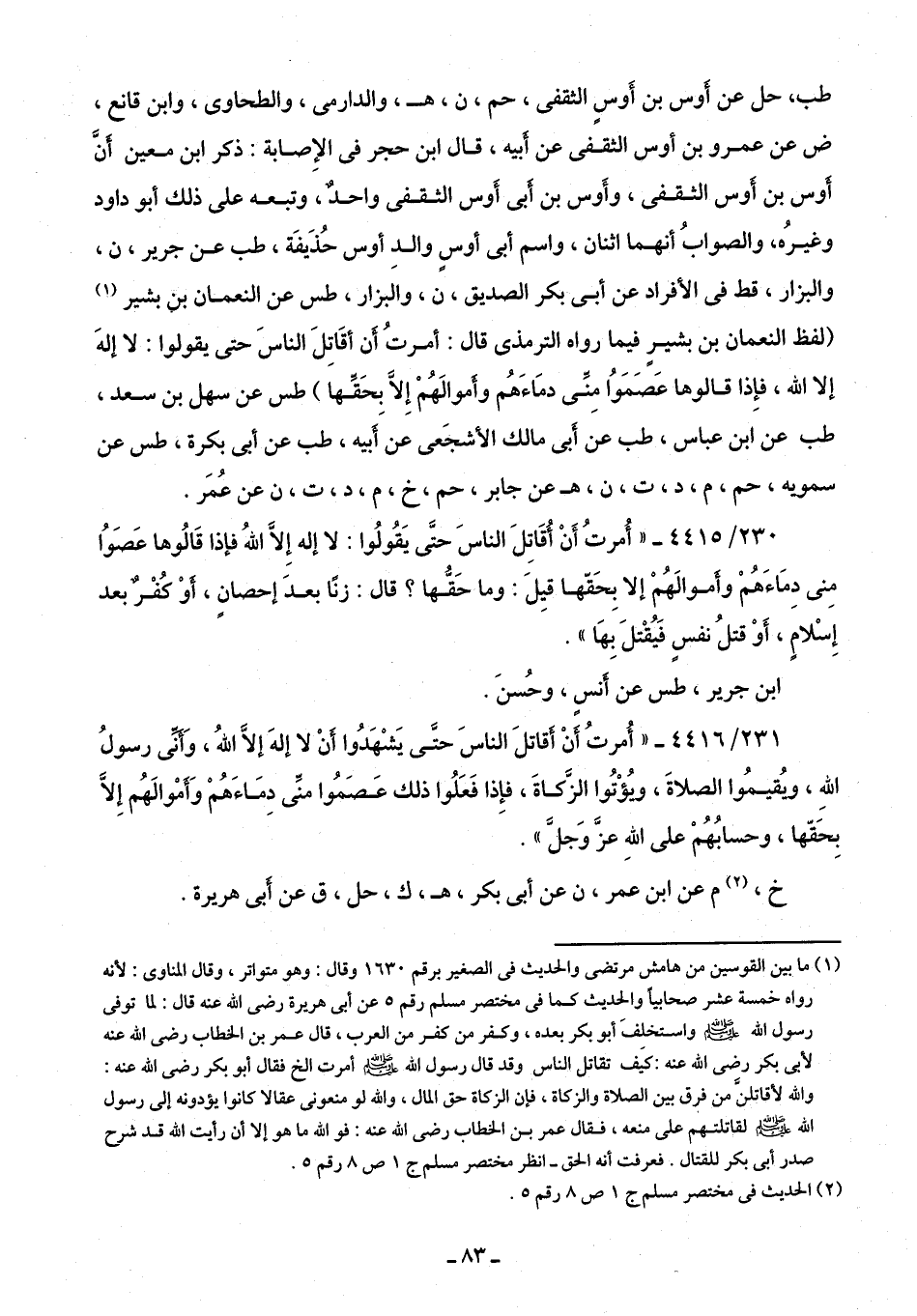 طب، حل عن أوس بن أَوس الثقفي، حم، ن، هـ، والدارمي، والطحاوي، وابن قانع، ض عن عمرو بن أوس الثقفي عن أبيه، قال ابن حجر في الإِصابة: ذكر ابن معين أنَّ أوس بن أوس الثقفي، وأَوس بن أبي أَوس الثقفي واحد، وتبعه على ذلك أبو داود وغيرُه، والصوابُ أنهما اثنان، واسم أبي أوسٍ والدِ أوس حُذَيفَة، طب عن جرير، ن، والبزار، قط في الأفراد عن أبي بكر الصديق، ن، والبزار، طس عن النعمان بن بشير (¬1) (لفظ النعمان بن بشير فيما رواه الترمذي قال: أمرتُ أن أقَاتِلَ الناسَ حتى يقولوا: لا إلهَ إلا الله، فإِذا قالوها عَصَمَوُا مِنِّي دمَاءَهُم وأموالهُمْ إلا بِحَقِّها) طس عن سهل بن سعد، طب عن ابن عباس، طب عن أبي مالك الأشجَعى عن أبيه، طب عن أبي بكرة، طس عن سمويه، حم، م، د، ت، ن، هـ عن جابر، حم، خ، م، د، ت، ن عن عُمَر.