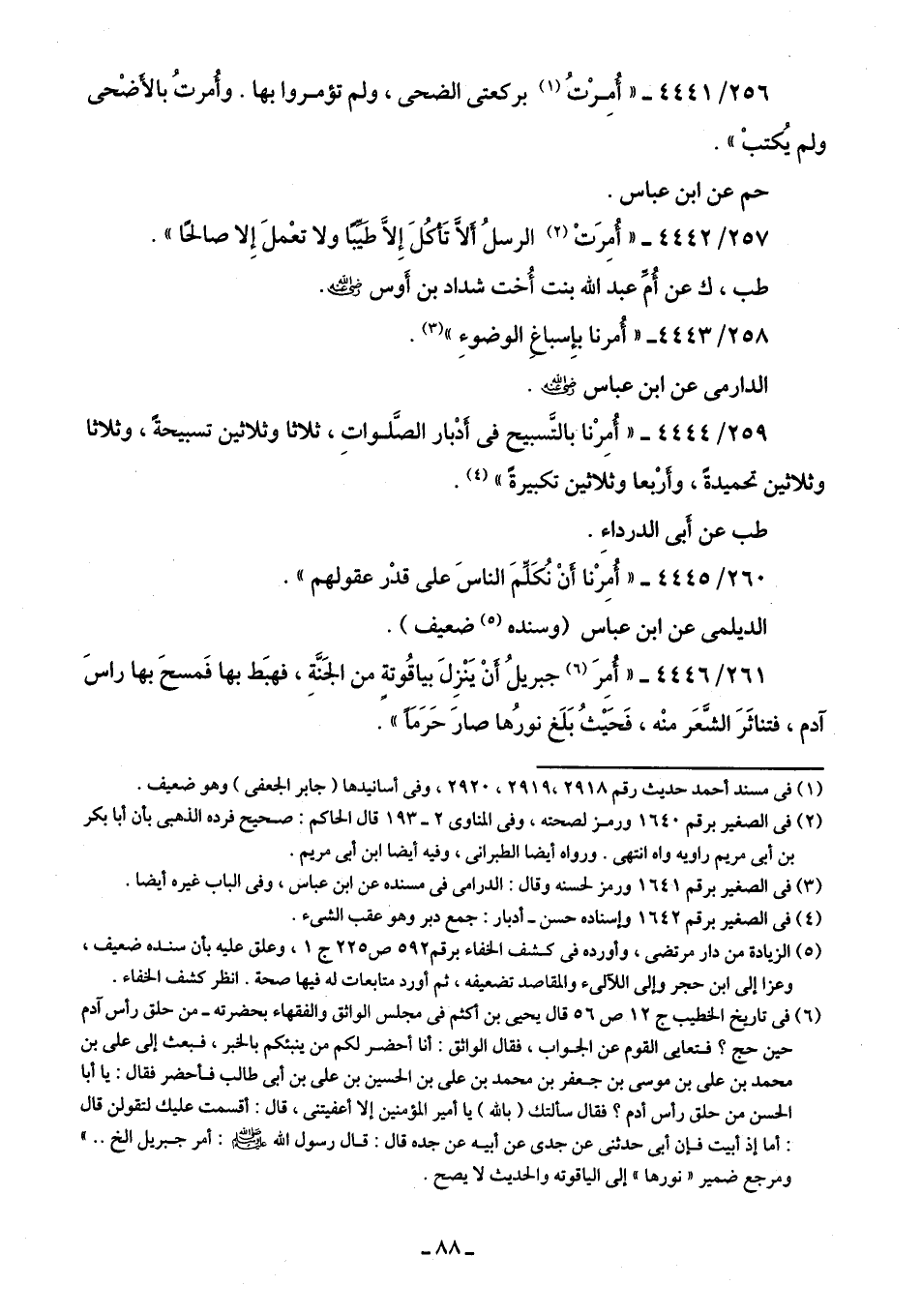 256/ 4441 - "أُمِرْتُ (¬1) بركعتى الضحى، ولم تؤمروا بها. وأُمرتُ بالأَضْحى ولم يُكتبْ".