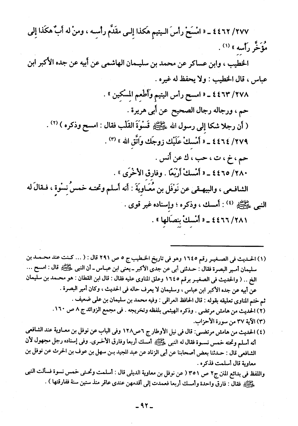 277/ 4462 - "امْسَحْ رأسَ اليتيمِ هَكذا إِلى مقَدَّم رأسِه، ومنْ له أَبٌ هكَذا إِلى مُؤَخَّر رَأْسِهِ" (¬1).