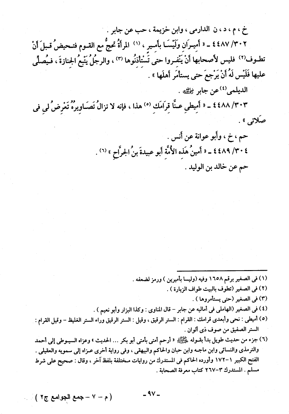 302/ 4487 - "أَمِيرَانِ وَلَيسَا بأَمِيرٍ، (¬1) المرأَةُ تحجُّ مع القوم فتحيضُ قبلَ أَنْ تطوف (¬2) فليس لأَصحابها أَنْ يَنْفِروا حتى تَسْتأذِنُوها (¬3)، والرجُلُ يَتْبعُ الجِنازةَ، فيُصلِّي عليها فَلَيس لَهُ أَنْ يَرْجعَ حتى يستأمَر أَهلَها".