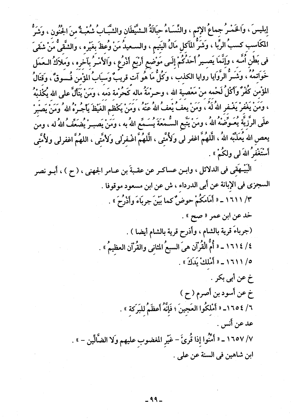 الْبَيهَقِى في "الدلائل، وابن عساكر عن عقبةَ بن عامر الجهني، (خ)، أَبو نصر السجزى في الإِبانة عن أَبي الدرداءِ، ش عن ابن مسعود موقوفًا.
