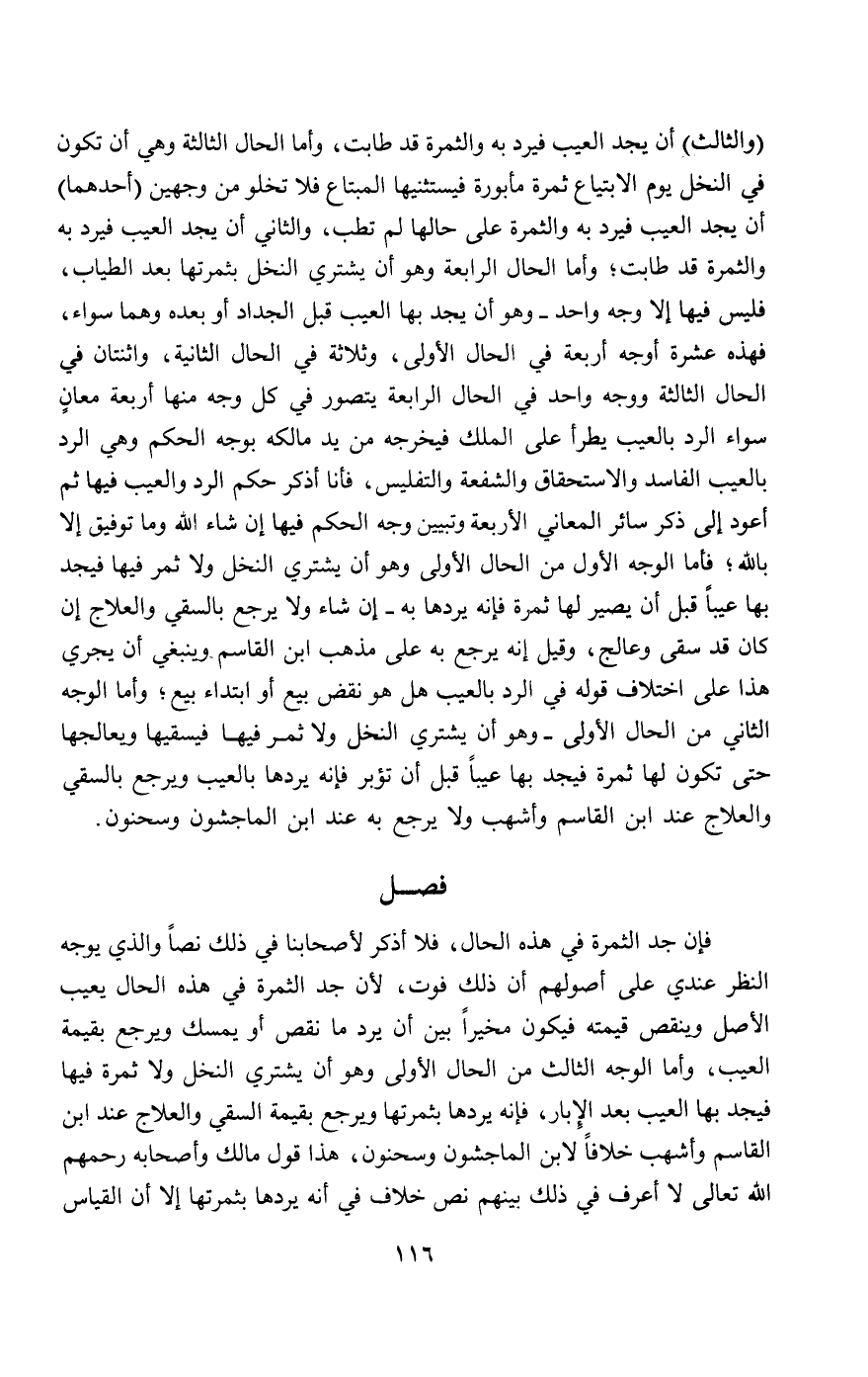 (والثالث) أن يجد العيب فيرد به والثمرة قد طابت، وأما الحال الثالثة وهي أن تكون في النخل يوم الابتياع ثمرة مأبورة فيستثنيها المبتاع، فلا تخلو من وجهين (أحدهما) أن يجد العيب فيرد به والثمرة على حالها لم تطب، (والثاني) أن يجد العيب فيرد به والثمرة قد طابت؛ وأما الحال الرابعة وهو أن يشتري النخل بثمرتها بعد الطياب، فليس فيها إلا وجه واحد - وهو أن يجد بها العيب قبل الجداد أو بعده وهما سواء، فهذه عشرة أوجه، أربعة في الحال الأولى، وثلاثة في الحال الثانية، واثنتان في الحال الثالثة، ووجه واحد في الحال الرابعة، يتصور في كل وجه منها أربعة معان، سواء الرد بالعيب يطرأ على الملك فيخرجه من يد مالكه بوجه الحكم، وهي الرد بالعيب الفاسد والاستحقاق والشفعة والتفليس، فأنا أذكر حكم الرد والعيب فيها ثم أعود إلى ذكر سائر المعاني الأربعة وتبيين وجه الحكم فيها، إن شاء الله، وما توفيقي إلا بالله؛ فأما الوجه الأول من الحال الأولى وهو أن يشتري النخل ولا ثمر فيها فيجد بها عيبا قبل أن يصير لها ثمرة فإنه يردها به إن شاء ولا يرجع بالسقي والعلاج إن كان قد سقى وعالج، وقيل: إنه يرجع به على مذهب ابن القاسم - وينبغي أن يجري هذا على اختلاف قوله في الرد بالعيب هل هو نقض بيع أو ابتداء بيع؛ وأما الوجه الثاني من الحال الأولى - وهو أن يشتري النخل ولا ثمر فيها فيسقيها ويعالجها حتى تكون لها ثمرة فيجد بها عيبا قبل أن تؤبر، فإنه يردها بالعيب ويرجع بالسقي والعلاج عند ابن القاسم وأشهب، ولا يرجع به عند ابن الماجشون وسحنون.