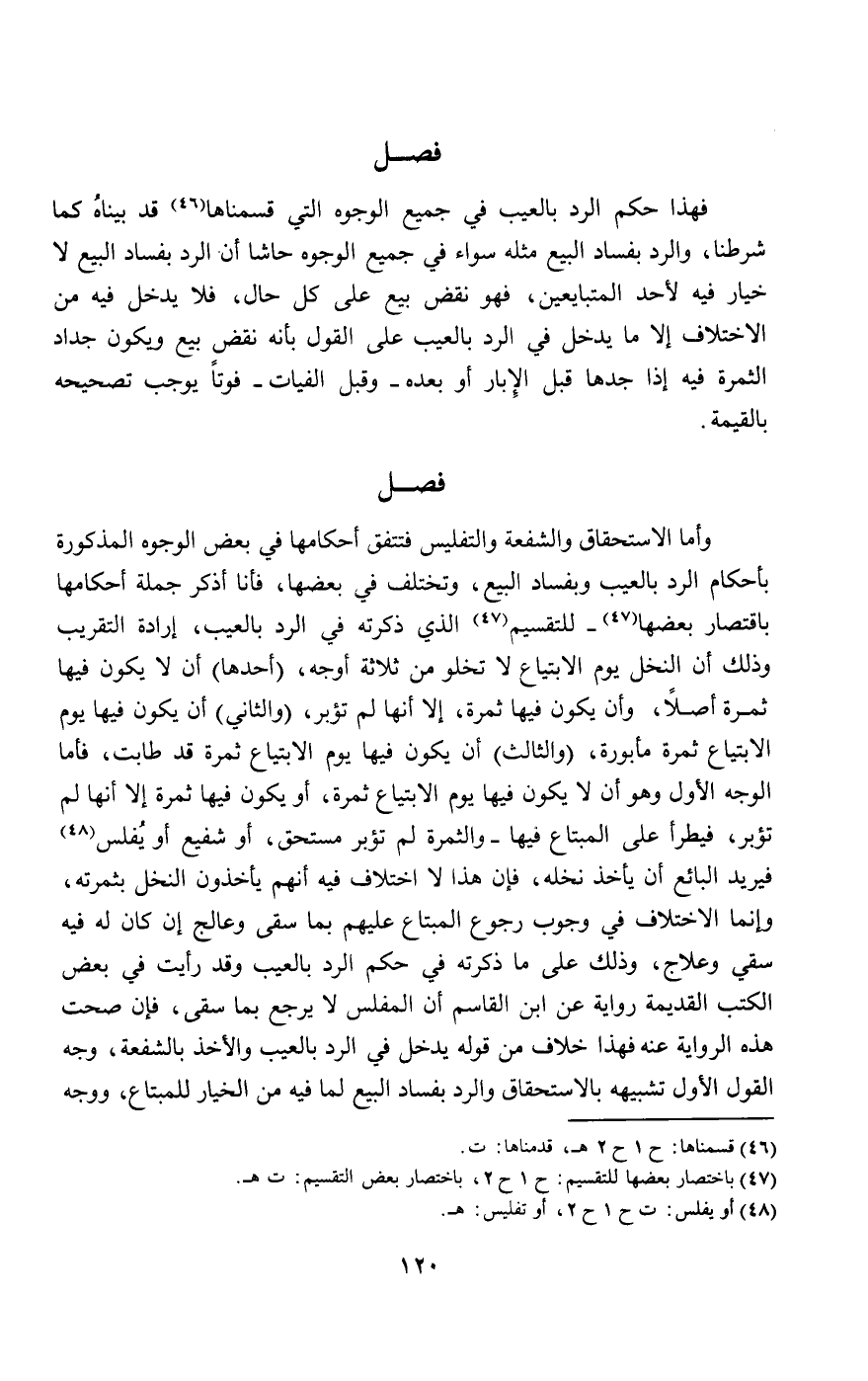 وأما الاستحقاق والشفعة والتفليس فتتفق أحكامها في بعض الوجوه المذكورة بأحكام الرد بالعيب وبفساد البيع، وتختلف في بعضها، فأنا أذكر جملة أحكامها باقتصار بعضها - للتقسيم الذي ذكرته في الرد بالعيب، إرادة التقريب، وذلك أن النخل يوم الابتياع لا تخلو من ثلاثة أوجه، (أحدها) أن لا يكون فيها ثمرة أصلا، وأن يكون فيها ثمرة، إلا أنها لم تؤبر، (والثاني) أن يكون فيها يوم الابتياع ثمرة مأبورة، (والثالث) أن يكون فيها يوم الابتياع ثمرة قد طابت، فأما الوجه الأول وهو أن لا يكون فيها يوم الابتياع ثمرة، أو يكون فيها ثمرة إلا أنها لم تؤبر، فيطرأ على المبتاع فيها - والثمرة لم تؤبر مستحق، أو شفيع أو يفلس فيريد البائع أن يأخذ نخله، فإن هذا لا اختلاف فيه أنهم يأخذون النخل بثمرته، وإنما الاختلاف في وجوب رجوع المبتاع عليهم بما سقى وعالج إن كان له فيه سقي وعلاج، وذلك على ما ذكرته في حكم الرد بالعيب، وقد رأيت في بعض الكتب القديمة رواية عن ابن القاسم أن المفلس لا يرجع بما سقى، فإن صحت هذه الرواية عنه فهذا خلاف من قوله يدخل في الرد بالعيب والأخذ بالشفعة، وجه القول الأول تشبيهه بالاستحقاق والرد بفساد البيع لما فيه من الخيار للمبتاع، ووجه