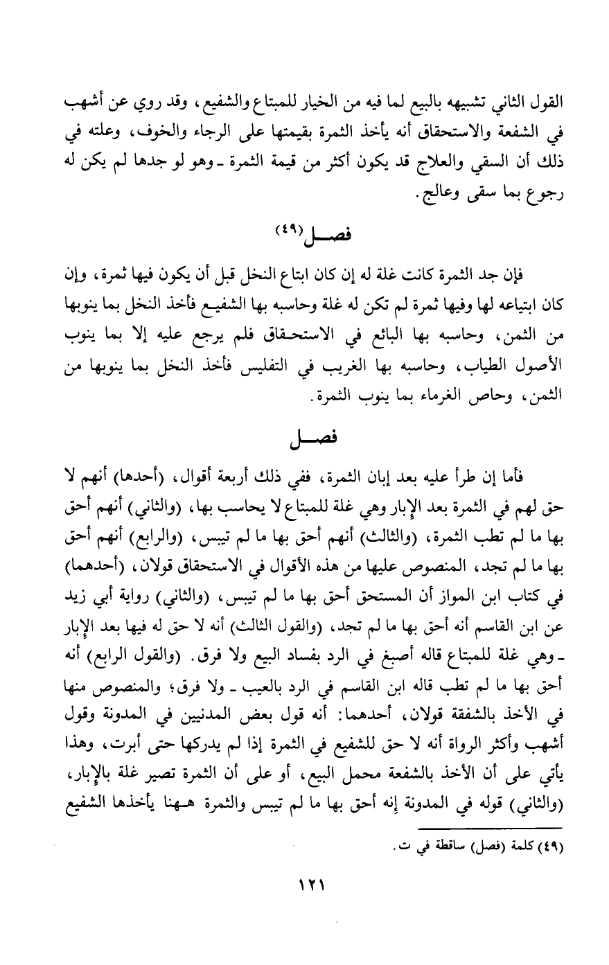 القول الثاني تشبيهه بالبيع لما فيه من الخيار للمبتاع والشفيع، وقد روي عن أشهب في الشفعة والاستحقاق أنه يأخذ الثمرة بقيمتها على الرجاء والخوف، وعلته في ذلك أن السقي والعلاج قد يكون أكثر من قيمة الثمرة - وهو لو جدها لم يكن له رجوع بما سقى وعالج.