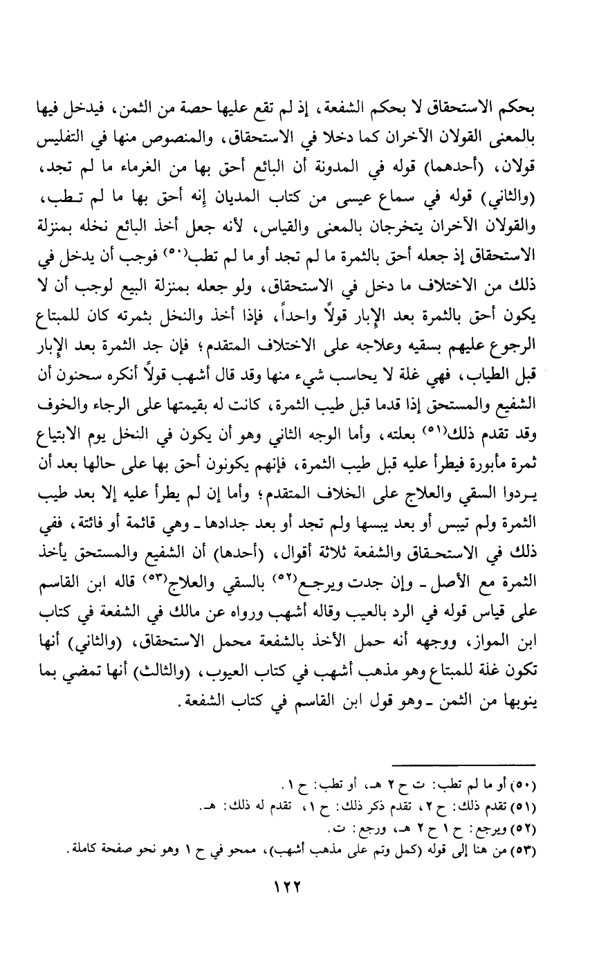 بحكم الاستحقاق لا بحكم الشفعة، إذ لم تقع عليها حصة ميت الثمن، فيدخل فيها بالمعنى القولان الآخران كما دخلا في الاستحقاق، والمنصوص منها في التفليس قولان، (أحدهما) قوله في المدونة: إن البائع أحق بها من الغرماء ما لم تجد، (والثاني) قوله في سماع عيسى من كتاب المديان: إنه أحق بها ما لم تطب، والقولان الآخران يتخرجان بالمعنى والقياس، لأنه جعل أخذ البائع نخله بمنزلة الاستحقاق؛ إذ جعله أحق بالثمرة ما لم تجد أو ما لم تطب. فوجب أن يدخل في ذلك من الاختلاف ما دخل في الاستحقاق، ولو جعله بمنزلة البيع لوجب أن لا يكون أحق بالثمرة بعد الإبار قولا واحدا، فإذا أخذ والنخل بثمرته كان للمبتاع الرجوع عليهم بسقيه وعلاجه، على الاختلاف المتقدم؛ فإن جد الثمرة بعد الإبار قبل الطياب، فهي غلة لا يحاسب شيء منها، وقد قال أشهب قولا أنكره سحنون، أن الشفيع والمستحق إذا قدما قبل طيب الثمرة، كانت له بقيمتها على الرجاء والخوف، وقد تقدم ذلك بعلته، وأما الوجه الثاني، وهو أن يكون في النخل يوم الابتياع ثمرة مأبورة فيطرأ عليه قبل طيب الثمرة، فإنهم يكونون أحق بها على حالها بعد أن يردوا السقي والعلاج، على الخلاف المتقدم؛ وأما إن لم يطرأ عليه إلا بعد طيب الثمرة ولم تيبس، أو بعد يبسها ولم تجد، أو بعد جدادها - وهي قائمة أو فائتة، ففي ذلك في الاستحقاق والشفعة ثلاثة أقوال، (أحدها) أن الشفيع والمستحق يأخذ الثمرة مع الأصل - وإن جدت، ويرجع بالسقي والعلاج، قاله ابن القاسم على قياس قوله في الرد بالعيب، وقاله أشهب ورواه عن مالك في الشفعة في كتاب ابن المواز، ووجهه أنه حمل الأخذ بالشفعة محمل الاستحقاق، (والثاني) أنها تكون غلة للمبتاع وهو مذهب أشهب في كتاب العيوب، (والثالث) أنها تمضي بما ينوبها من الثمن - وهو قول ابن القاسم في كتاب الشفعة.