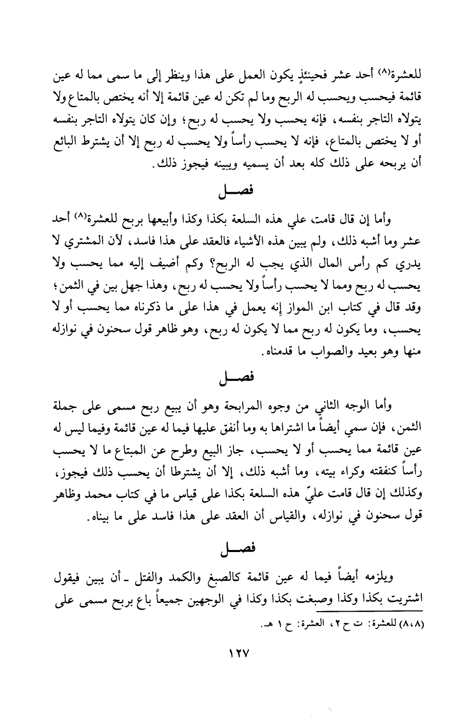 للعشرة أحد عشر، فحينئذ يكون العمل على هذا، وينظر إلى ما سم مما له عين قائمة، فيحسب ويحسب له الربح، وما لم تكن له عين قائمة إلا أنه يختص بالمتاع ولا يتولاه التاجر بنفسه، فإنه يحسب ولا يحسب له ربح؛ وإن كان يتولاه التاجر بنفسه أو لا يختص بالمتاع، فإنه لا يحسب رأسا ولا يحسب له ربح إلا أن يشترط البائع أن يربحه على ذلك كله بعد أن يسميه ويبينه، فيجوز ذلك.
