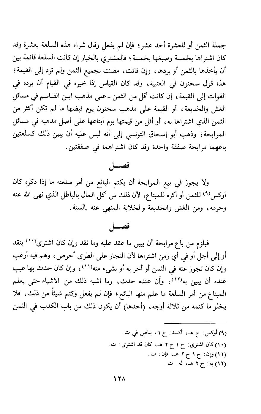 جملة الثمن أو للعشرة أحد عشرة، فإن لم يفعل وقال: شراء هذه السلعة بعشرة، وقد كان اشتراها بخمسة وصبغها بخمسة؛ فالمشتري بالخيار إن كانت السلعة قائمة بين أن يأخذها بالثمن أو يردها، وإن فاتت مضت بجميع الثمن ولم ترد إلى القيمة؛ هذا قول سحنون في العتبية، وقد كان القياس إذا خيره في القيام أن يرده في الفوات إلى القيمة، إن كانت أقل من الثمن - على مذهب ابن القاسم في مسائل الغش والخديعة، أو القيمة على مذهب سحنون يوم قبضها ما لم تكن أكثر من الثمن الذي اشتراها به، أو أقل من قيمتها يوم ابتاعها على أصل مذهبه في مسائل المرابحة؛ وذهب أبو إسحاق التونسي إلى أنه ليس عليه أن يبين ذلك، كسلعتين باعهما مرابحة صفقة واحدة وقد كان اشتراهما في صفقتين.