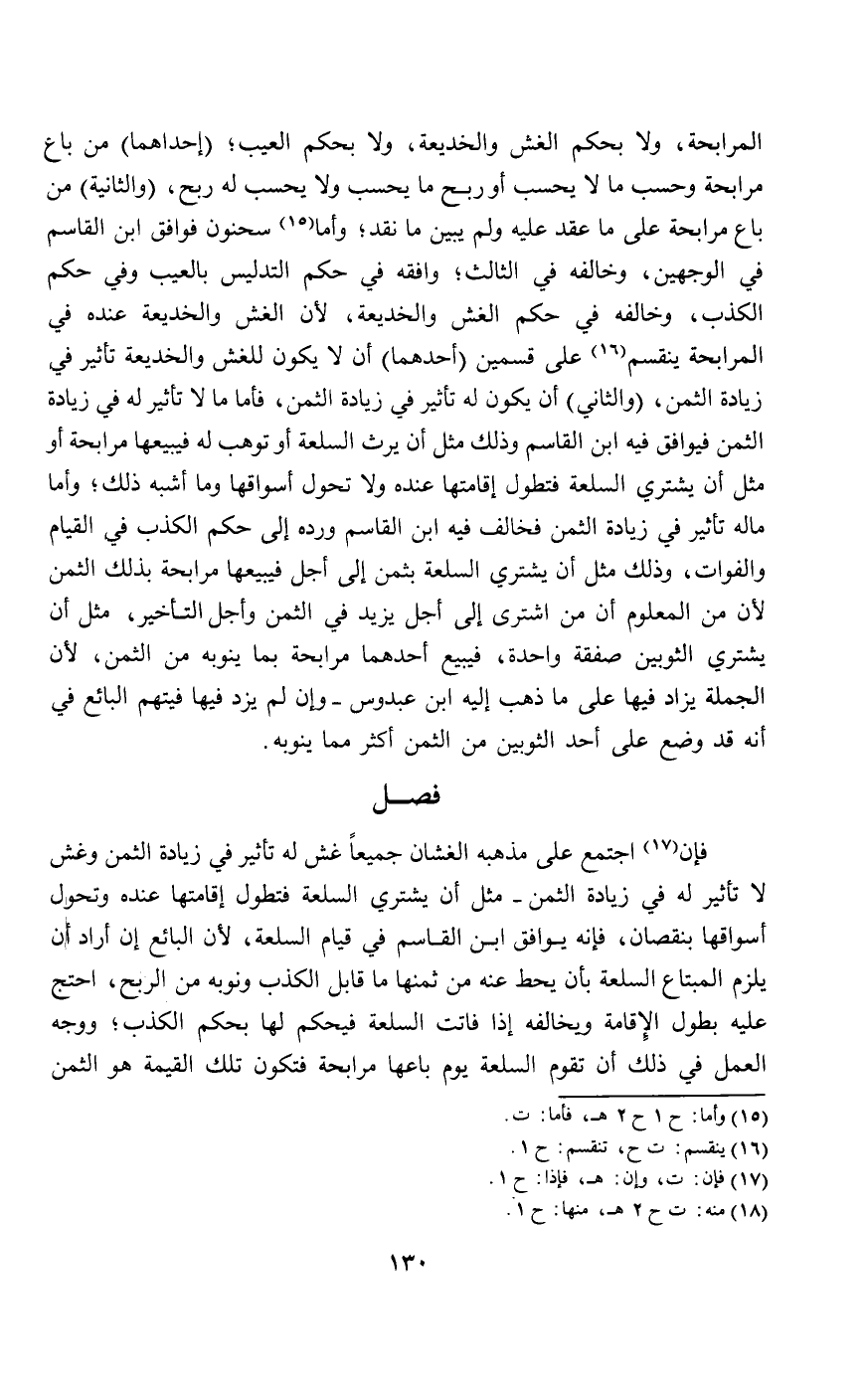 المرابحة، ولا بحكم الغش والخديعة، ولا بحكم العيب؛ (إحداهما) من باع مرابحة وحسب ما لا يحسب أو ربح ما يحسب ولا يحسب له ربح، (والثانية) من باع مرابحة على ما عقد عليه ولم يبين ما نقد؛ وأما سحنون فوافق ابن القاسم في الوجهين، وخالفه في الثالث؛ وافقه في حكم التدليس بالعيب وفي حكم الكذب، وخالفه في حكم الغش والخديعة؛ لأن الغش والخديعة عنده في المرابحة ينقسم على قسمين (أحدهما) أن لا يكون للغش والخديعة تأثير في زيادة الثمن، (والثاني) أن يكون له تأثير في زيادة الثمن، فأما ما لا تأثير له في زيادة الثمن فيوافق فيه ابن القاسم، وذلك مثل: أن يرث السلعة أو توهب له فيبيعها مرابحة، أو مثل: أن يشتري السلعة فتطول إقامتها عنده ولا تحول أسواقها وما أشبه ذلك. وأما ما له تأثير في زيادة الثمن فخالف فيه ابن القاسم ورده إلى حكم الكذب في القيام والفوات، وذلك مثل: أن يشتري السلعة بثمن إلى أجل فيبيعها مرابحة بذلك الثمن؛ لأن من المعلوم أن من اشترى إلى أجل يزيد في الثمن وأجل التأخير، مثل أن: يشتري الثوبين صفقة واحدة، فيبيع أحدهما مرابحة بما ينوبه من الثمن؛ لأن الجملة يزاد فيها على ما ذهب إليه ابن عبدوس - وإن لم يزد فيها فيتهم البائع في أنه قد وضع على أحد الثوبين من الثمن أكثر مما ينوبه.