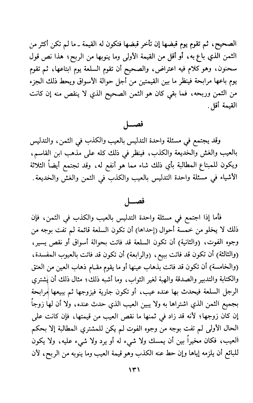الصحيح، ثم تقوم يوم قبضها إن تأخر قبضها فتكون له القيمة - ما لم تكن أكثر من الثمن الذي باع به، أو أقل من القيمة الأولى وما ينوبها من الربح؛ هذا نص قول سحنون، وهو كلام فيه اعتراض، والصحيح أن تقوم السلعة يوم ابتاعها، ثم تقوم يوم باعها مرابحة، فينظر ما بين القيمتين من أجل حوالة الأسواق ويحط ذلك الجزء من الثمن وربحه، فما بقي كان هو الثمن الصحيح الذي لا ينقص منه إن كانت القيمة أقل.
