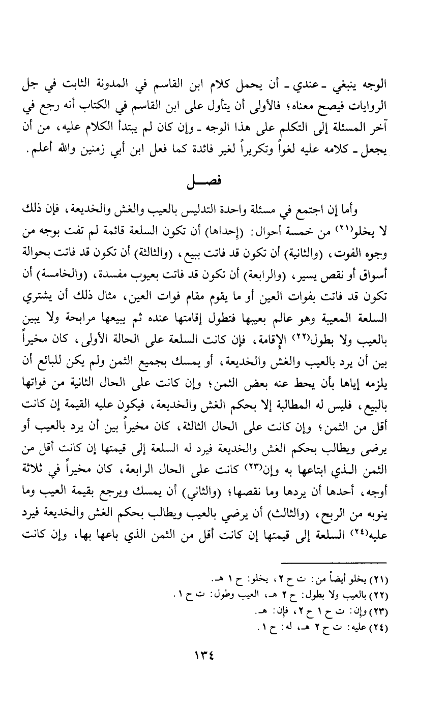 الوجه ينبغي - عندي - أن يحمل كلام ابن القاسم في المدونة الثابت في جل الروايات فيصح معناه، فالأولى أن يتأول على ابن القاسم في الكتاب أنه رجع في آخر المسألة إلى التكلم على هذا الوجه - وإن كان لم يُبتدَأ الكلام عليه، من أن يجعل - كلامه عليه لغوا وتكريرا لغير فائدة كما فعل ابن أبي زمنين والله أعلم.