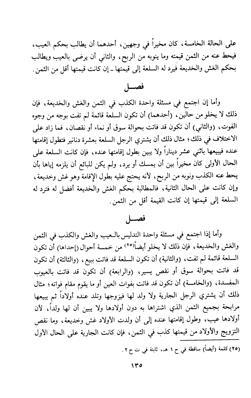 (إحداها) أن تكون السلعة قائمة لم تفت، (والثانية) أن تكون السلعة قد فاتت ببيع، (والثالثة) أن تكون قد فاتت بحوالة سوق أو نقص يسير، (والرابعة) أن تكون قد فاتت بالعيوب المفسدة، (والخامسة) أن تكون قد فاتت بفوات العين أو ما يقوم مقام فواته؛ مثال ذلك: أن يشتري الرجل الجارية ولا ولد لها فيزوجها وتلد عنده أولادا، ثم يبيعها مرابحة بجميع الثمن الذي اشتراها به دون أولادها ولا يبين أن لها ولدا؛ لأن أولادها عيب، وطول إقامتها عنده إلى أن ولدت الأولاد غش وخديعة، وما نقص التزويج والأولاد من قيمتها كذب في الثمن، فإن كانت الجارية على الحال الأول