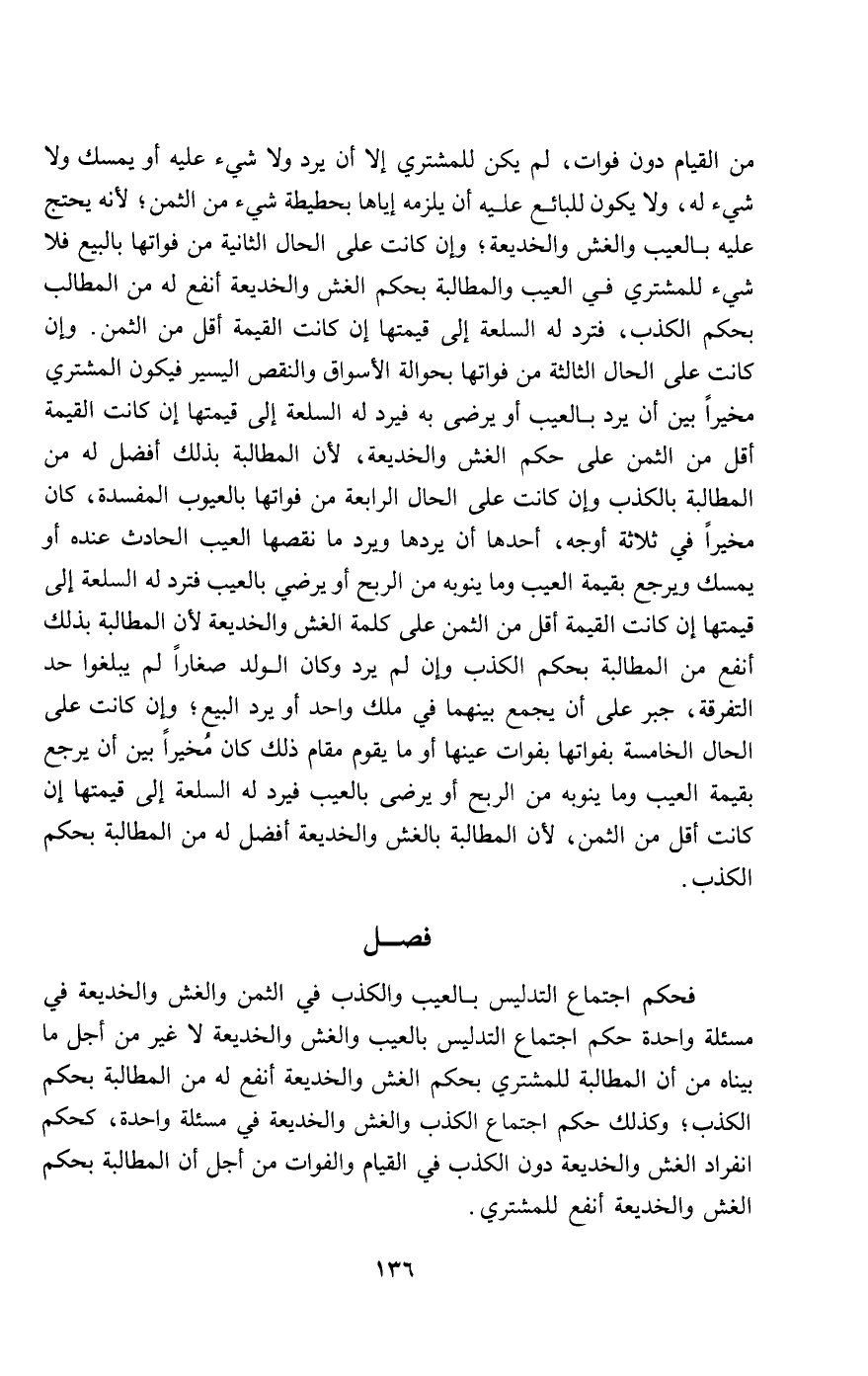 من القيام دون فوات، لم يكن للمشتري إلا أن يرد ولا شيء عليه أو يمسك ولا شيء له، ولا يكون للبائع عليه أن يلزمه إياها بحطيطة شيء من الثمن، لأنه يحتج عليه بالعيب والغش والخديعة؛ وإن كانت على الحال الثانية من فواتها بالبيع فلا شيء للمشتري في العيب والمطالبة بحكم الغش والخديعة أنفع له من المطالب بحكم الكذب، فترد له السلعة إلى قيمتها إن كانت القيمة أقل من الثمن. وإن كانت على الحال الثالثة من فواتها بحوالة الأسواق والنقص اليسير؛ فيكون المشتري مخيرا بين أن يرد بالعيب أو يرضى به، فيرد له السلعة إلى قيمتها إن كانت القيمة أقل من الثمن على حكم الغش والخديعة؛ لأن المطالبة بذلك أفضل له من المطالبة بالكذب.
