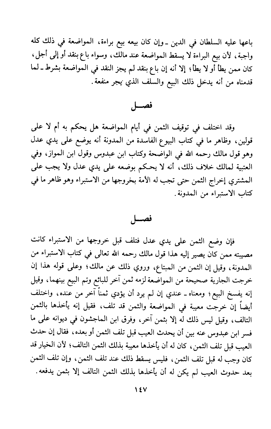 وقد اختلف في توقيف الثمن في أيام المواضعة؛ هل يحكم به أم لا؟ على قولين، وظاهر ما في كتاب البيوع الفاسدة من المدونة أنه يوضع على يدي عدل، وهو قول مالك - رَحِمَهُ اللَّهُ - في الواضحة وكتاب ابن عبدوس وقول ابن المواز، وفي العتبية لمالك خلاف ذلك، أنه لا يحكم بوضعه على يدي عدل ولا يجب على المشتري إخراج الثمن حتى تجب له الأمة بخروجها من الاستبراء وهو ظاهر ما في كتاب الاستبراء من المدونة.