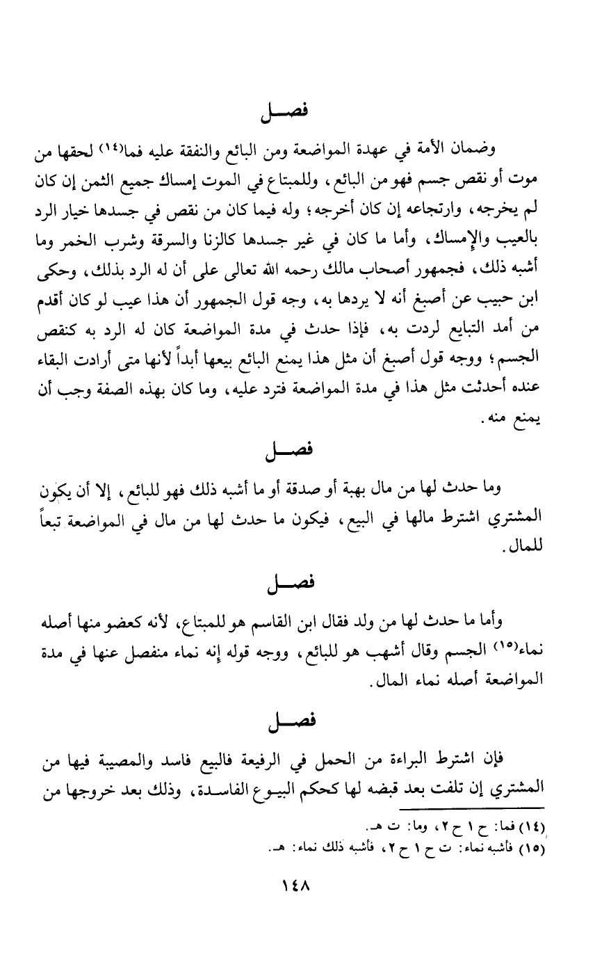 وضمان الأمة في عهدة المواضعة ومن البائع والنفقة عليه فما لحقها من موت أو نقص جسم فهو من البائع، وللمبتاع في الموت إمساك جميع الثمن إن كان لم يخرجه، وارتجاعه إن كان أخرجه؛ وله فيما كان من نقص في جسدها خيار الرد بالعيب والإمساك، وأما ما كان في غير جسدها كالزنا والسرقة وشرب الخمر وما أشبه ذلك، فجمهور أصحاب مالك - رَحِمَهُ اللَّهُ تَعَالَى - على أن له الرد بذلك، وحكى ابن حبيب عن أصبغ أنه لا يردها به، وجه قول الجمهور: أن هذا عيب لو كان أقدم من أمد التبايع لردت به، فإذا حدث في مدة المواضعة كان له الرد به كنقص الجسم؛ ووجه قول أصبغ: أن مثل هذا يمنع البائع بيعها أبدا؛ لأنها متى أرادت البقاء عنده أحدثت مثل هذا في مدة المواضعة فترد عليه، وما كان بهذه الصفة وجب أن يمنع منه.