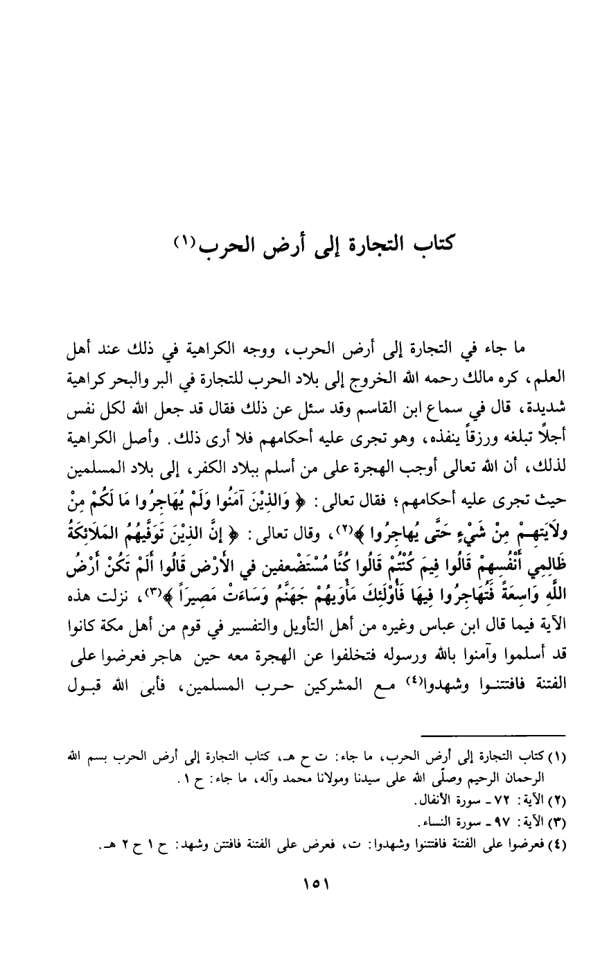 كره مالك - رَحِمَهُ اللَّهُ - الخروج إلى بلاد الحرب للتجارة في البر والبحر كراهية شديدة، قال في سماع ابن القاسم وقد سئل عن ذلك، فقال: قد جعل الله لكل نف5554س أجلا تبلغه ورزقا ينفذه، وهو تجرَى عليه أحكامهم فلا أرى ذلك. وأصل الكراهية لذلك، أن الله تعالى أوجب الهجرة على من أسلم ببلاد الكفر، إلى بلاد المسلمين حيث تجرى عليه أحكامهم؛ فقال تعالى: {وَالَّذِينَ آمَنُوا وَلَمْ يُهَاجِرُوا مَا لَكُمْ مِنْ وَلايَتِهِمْ مِنْ شَيْءٍ حَتَّى يُهَاجِرُوا} [الأنفال: 72]، وقال تعالى: {إِنَّ الَّذِينَ تَوَفَّاهُمُ الْمَلائِكَةُ ظَالِمِي أَنْفُسِهِمْ قَالُوا فِيمَ كُنْتُمْ قَالُوا كُنَّا مُسْتَضْعَفِينَ فِي الأَرْضِ قَالُوا أَلَمْ تَكُنْ أَرْضُ اللَّهِ وَاسِعَةً فَتُهَاجِرُوا فِيهَا فَأُولَئِكَ مَأْوَاهُمْ جَهَنَّمُ وَسَاءَتْ مَصِيرًا} [النساء: 97]، نزلت هذه الآية - فيما قال ابن عباس وغيره من أهل التأويل والتفسير - في قوم من أهل مكة كانوا قد أسلموا وآمنوا بالله ورسوله فتخلفوا عن الهجرة معه حين هاجر فعرضوا على الفتنة فافتتنوا وشهدوا مع المشركين حرب المسلمين، فأبى الله قبول