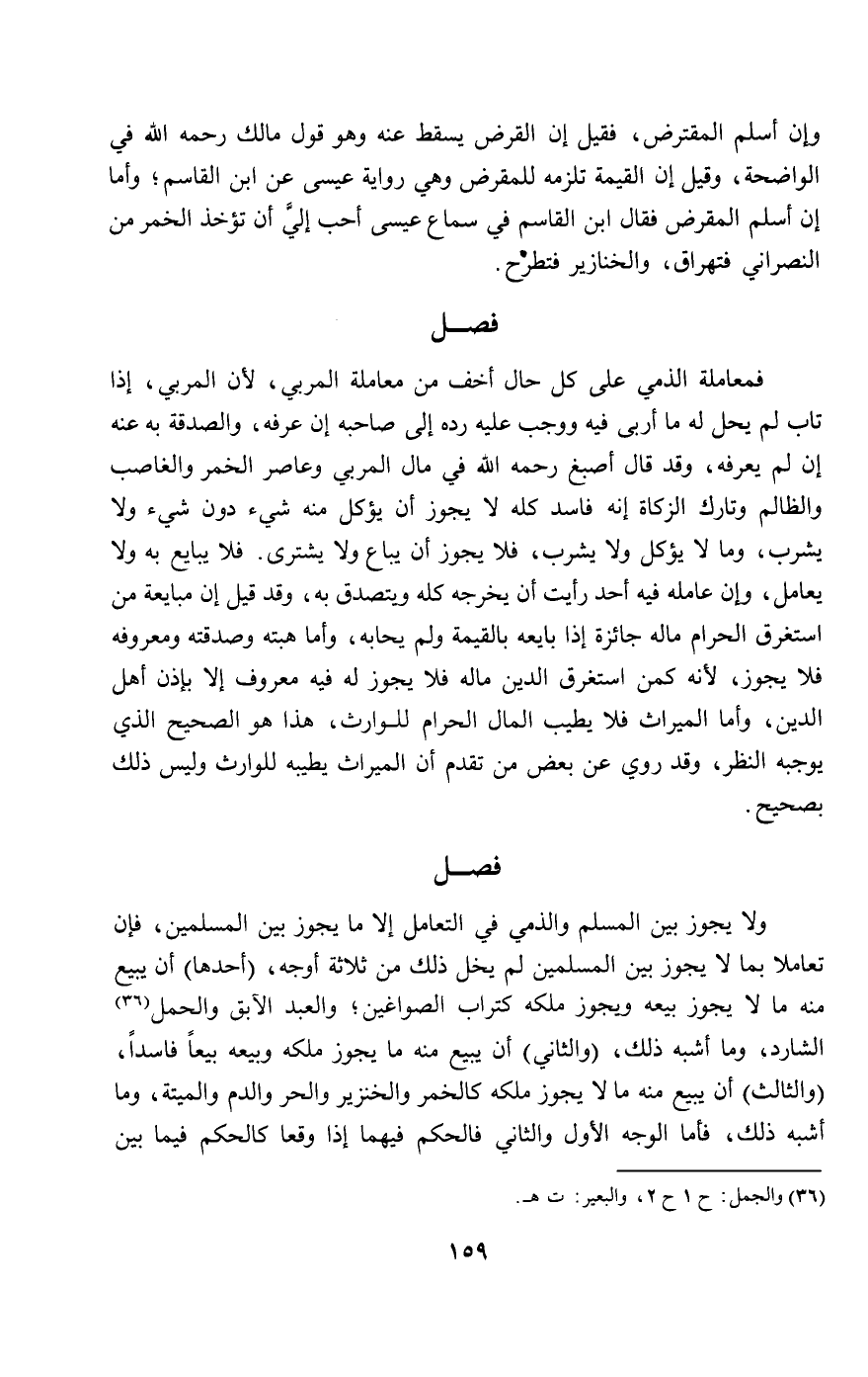 ولا يجوز بين المسلم والذمي في التعامل إلا ما يجوز بين المسلمين، فإن تعاملا بما لا يجوز بين المسلمين لم يخل ذلك من ثلاثة أوجه: