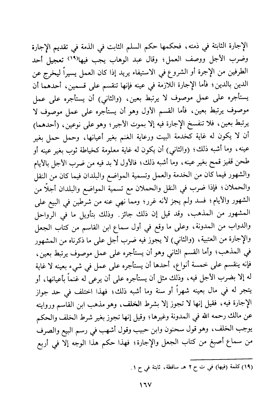 الإجارة الثابتة في ذمته، فحكمها حكم السلم الثابت في الذمة في تقديم الإجارة وضرب الأجل ووصف العمل، وقال عبد الوهاب: يجب فيها تعجيل أحد الطرفين من الأجرة أو الشروع في الاستيفاء، يريد: إذا كان العمل يسيرا ليخرج عن الدين بالدين، فأما الإجارة اللازمة في عينه، فإنها تنقسم على قسمين، أحدهما: أن يستأجره على عمل موصوف لا يرتبط بعين، (والثاني) أن يستأجره على عمل موصوف يرتبط بعين، فأما القسم الأول وهو أن يستأجره على عمل موصوف لا يرتبط بعين، فلا تنفسخ الإجارة فيه إلا بموت الأجير، وهو على نوعين، (أحدهما) أن لا يكون له غاية كخدمة البيت ورعاية الغنم بغير أعيانها، وحمل حمل بغير عينه، وما أشبه ذلك، (والثاني) أن يكون له غاية معلومة كخياطة ثوب بغير عينه أو طحن قفيز قمح بغير عينه، وما أشبه ذلك، فالأول لا بد فيه من ضرب الأجل بالأيام والشهور فيما كان من الخدمة والعمل وتسمية المواضع والبلدان فيما كان من النقل والحملان؛ فإذا ضرب في النقل والحملان مع تسمية المواضع والبلدان أجلا من الشهور والأيام، فسد ولم يجز لأنه غرر؛ ومما نهي عنه من شرطين في البيع على المشهور من المذهب، وقد قيل: إن ذلك جائز. وذلك بتأويل ما في الرواحل والدواب من المدونة، وعلى ما وقع في أول سماع ابن القاسم من كتاب الجعل والإجارة من العتبية، (والثاني) لا يجوز فيه ضرب أجل على ما ذكرناه من المشهور في المذهب؛ وأما القسم الثاني وهو أن يستأجره على عمل موصوف يرتبط بعين، فإنه ينقسم على خمسة أنواع: