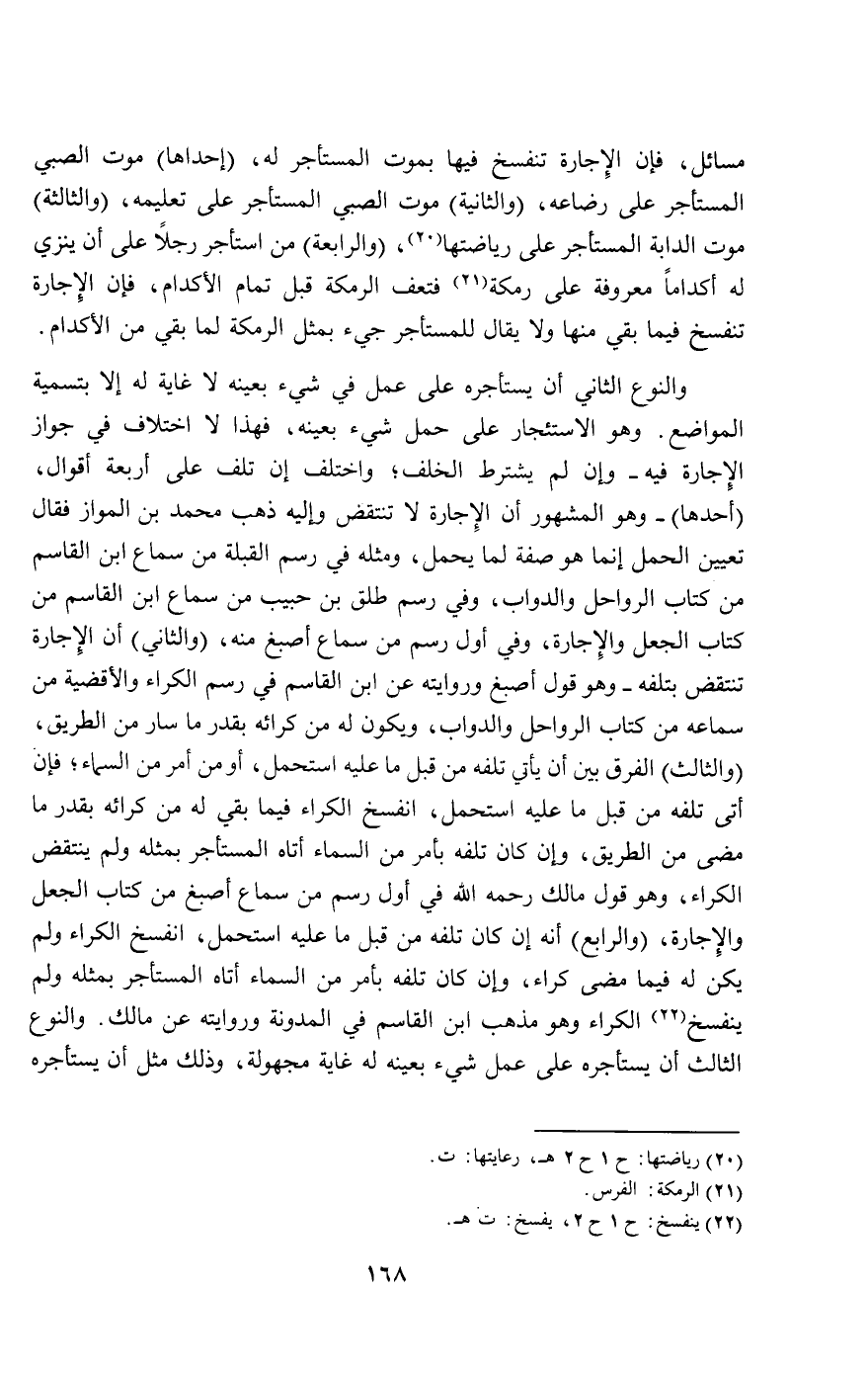 والنوع الثاني: أن يستأجره على عمل في شيء بعينه لا غاية له إلا بتسمية المواضع. وهو الاستئجار على حمل شيء بعينه، فهذا لا اختلاف في جواز الإجارة فيه - وإن لم يشترط الخلف؛ واختلف إن تلف على أربعة أقوال، (أحدها) - وهو المشهور أن الإجارة لا تنتقض وإليه ذهب محمد بن المواز، فقال: تعيين الحمل إنما هو صفة لما يحمل، ومثله في رسم القبلة من سماع ابن القاسم من كتاب الرواحل والدواب، وفي رسم طلق بن حبيب من سماع ابن القاسم من كتاب الجعل والإجارة، وفي أول رسم من سماع أصبغ منه، (والثاني) أن الإجارة تنتقض بتلفه - وهو قول أصبغ وروايته عن ابن القاسم في رسم الكراء والأقضية من سماعه من كتاب الرواحل والدواب، ويكون له من كرائه بقدر ما سار من الطريق، (والثالث) الفرق بين أن يأتي تلفه من قبل ما عليه استحمل، أو من أمر من السماء؛ فإن أتى تلفه من قبل ما عليه استحمل، انفسخ الكراء فيما بقي له من كرائه بقدر ما مضى من الطريق، وإن كان تلفه بأمر من السماء أتاه المستأجر بمثله ولم ينتقض الكراء، وهو قول مالك - رَحِمَهُ اللَّهُ - في أول رسم من سماع أصبغ من كتاب الجعل والإجارة، (والرابع) أنه إن كان تلفه من قبل ما عليه استحمل، انفسخ الكراء ولم يكن له فيما مضى كراء، وإن كان تلفه بأمر من السماء أتاه المستأجر بمثله ولم ينفسخ الكراء، وهو مذهب ابن القاسم في المدونة وروايته عن مالك. (والنوع الثالث) أن يستأجره على عمل شيء بعينه له غاية مجهولة، وذلك مثل أن يستأجره