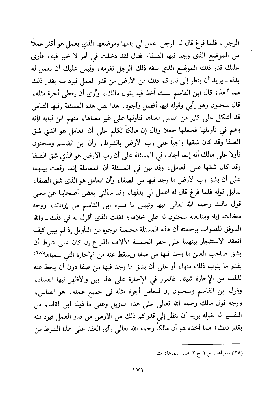 الرجل، فلما فرغ قال له الرجل: اعمل لي بدلها وموضعها الذي يعمل هو أكثر عملا من الموضع الذي وجد فيها الصفا؛ فقال: لقد دخلت في أمر لا خير فيه، فأرى عليك قدر ذلك الموضع الذي شقه ذلك الرجل تغرمه، وليس عليك أن تعمل له بدله - يريد أن ينظر إلى قدر كم ذلك من الأرض من قدر العمل فيرد منه بقدر ذلك مما أخذ؛ قال ابن القاسم: لست آخذ فيه بقول مالك، وأرى أن يعطى أجرة مثله، قال سحنون: وهو رأيي، وقوله فيها أفضل وأجود، هذا نص هذه المسألة وفيها التباس قد أشكل على كثير من الناس معناها فتأولها على غير معناها، منهم ابن لبابة؛ فإنه وهم في تأويلها فجعلها جعلا، وقال: إن مالكا تكلم على أن العامل هو الذي شق الصفا، وقد كان شقها واجبا على رب الأرض بالشرط، وأن ابن القاسم وسحنون تأولا على مالك أنه إنما أجاب في المسألة على أن رب الأرض هو الذي شق الصفا وقد كان شقها على العامل، وقد بين في المسألة أن المعاملة إنما وقعت بينهما على أن يشق رب الأرض ما وجد فيها من الصفا، وأن العامل هو الذي شق الصفا، بدليل قوله: فلما فرغ قال له: اعمل لي بدلها، وقد سألني بعض أصحابنا عن معنى قول مالك - رَحِمَهُ اللَّهُ تَعَالَى - فيها وتبيين ما فسره ابن القاسم من إرادته، ووجه مخالفته إياه ومتابعته سحنون له على خلافه؛ فقلت: الذي أقول به في ذلك - والله الموفق للصواب برحمته أن هذه المسألة محتملة لوجوه من التأويل؛ إذ لم يبين كيف انعقد الاستئجار بينهما على حفر الخمسة الآلاف الذراع إن كان على شرط أن يشق صاحب العين ما وجد فيها من صفا ويسقط عنه من الإجارة التي سمياها بقدر ما ينوب ذلك منها، أو على أن يشق ما وجد فيها من صفا دون أن يحط عنه لذلك من الإجارة شيئا، فالغرر في الإجارة على هذا بين والأظهر فيها الفساد، وقول ابن القاسم وسحنون: إن للعامل أجرة مثله في جميع عمله، هو القياس، ووجه قول مالك - رَحِمَهُ اللَّهُ تَعَالَى - على هذا التأويل وعلى ما ذيله ابن القاسم من التفسير له بقوله: يريد أن ينظر إلى قدر كم ذلك من الأرض من قدر العمل فيرد منه بقدر ذلك؛ مما أخذه هو أن مالكا - رَحِمَهُ اللَّهُ تَعَالَى - رأى العقد على هذا الشرط من