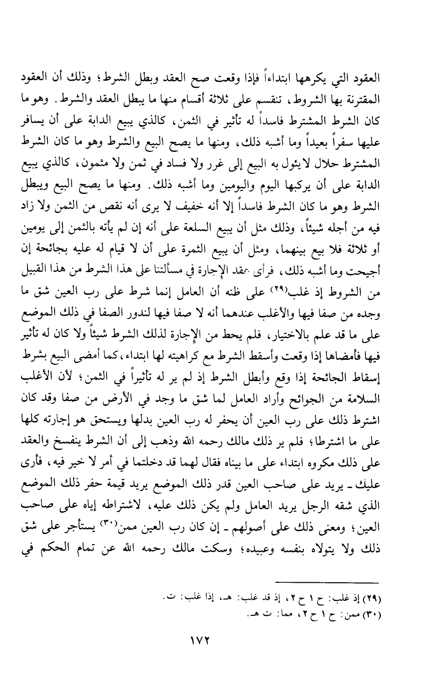 العقود التي يكرهها ابتداءً فإذا وقعت صح العقد وبطل الشرط؛ وذلك أن العقود المقترنة بها الشروط، تنقسم على ثلاثة أقسام؛ منها ما يبطل العقد والشرط، وهو ما كان الشرط المشترط فاسدا له تأثير في الثمن، كالذي يبيع الدابة على أن يسافر عليها سفرا بعيدا وما أشبه ذلك، ومنها ما يصح البيع والشرط، وهو ما كان الشرط المشترط حلال لا يئول به البيع إلى غرر ولا فساد في ثمن ولا مثمون، كالذي يبيع الدابة على أن يركبها اليوم واليومين وما أشبه ذلك. ومنها ما يصح البيع ويبطل الشرط وهو ما كان الشرط فاسدا إلا أنه خفيف لا يرى أنه نقص من الثمن ولا زاد فيه من أجله شيئا، وذلك مثل أن: يبيع السلعة على أنه إن لم يأته بالثمن إلى يومين أو ثلاثة فلا بيع بينهما، ومثل أن: يبيع الثمرة على أن لا قيام له عليه بجائحة إن أجيحت وما أشبه ذلك، فرأى عقد الإجارة في مسألتنا على هذا الشرط من هذا القبيل من الشروط إذ غلب على ظنه أن العامل إنما شرط على رب العين شق ما وجده من صفا فيها، والأغلب عندهما أنه لا صفا فيها لندور الصفا في ذلك الموضع على ما قد علم بالاختيار، فلم يحط من الإجارة لذلك الشرط شيئا ولا كان له تأثير فيها فأمضاها إذا وقعت وأسقط الشرط مع كراهيته لها ابتداء، كما أمضى البيع بشرط إسقاط الجائحة إذا وقع وأبطل الشرط إذ لم ير له تأثيرا في الثمن؛ لأن الأغلب السلامة من الجوائح وأراد العامل لما شق ما وجد في الأرض من صفا، وقد كان اشترط ذلك على رب العين أن يحفر له رب العين بدلها ويستحق هو إجارته كلها على ما اشترطا؛ فلم ير ذلك مالك - رَحِمَهُ اللَّهُ - وذهب إلى أن الشرط ينفسخ والعقد على ذلك مكروه ابتداء على ما بيناه، فقال لهما: قد دخلتما في أمر لا خير فيه، فأرى عليك - يريد على صاحب العين قدر ذلك الموضع يريد قيمة حفر ذلك الموضع الذي شقه الرجل يريد العامل ولم يكن ذلك عليه، لاشتراطه إياه على صاحب العين؛ ومعنى ذلك على أصولهم - إن كان رب العين ممن يستأجر على شق ذلك ولا يتولاه بنفسه وعبيده، وسكت مالك - رَحِمَهُ اللَّهُ - عن تمام الحكم في