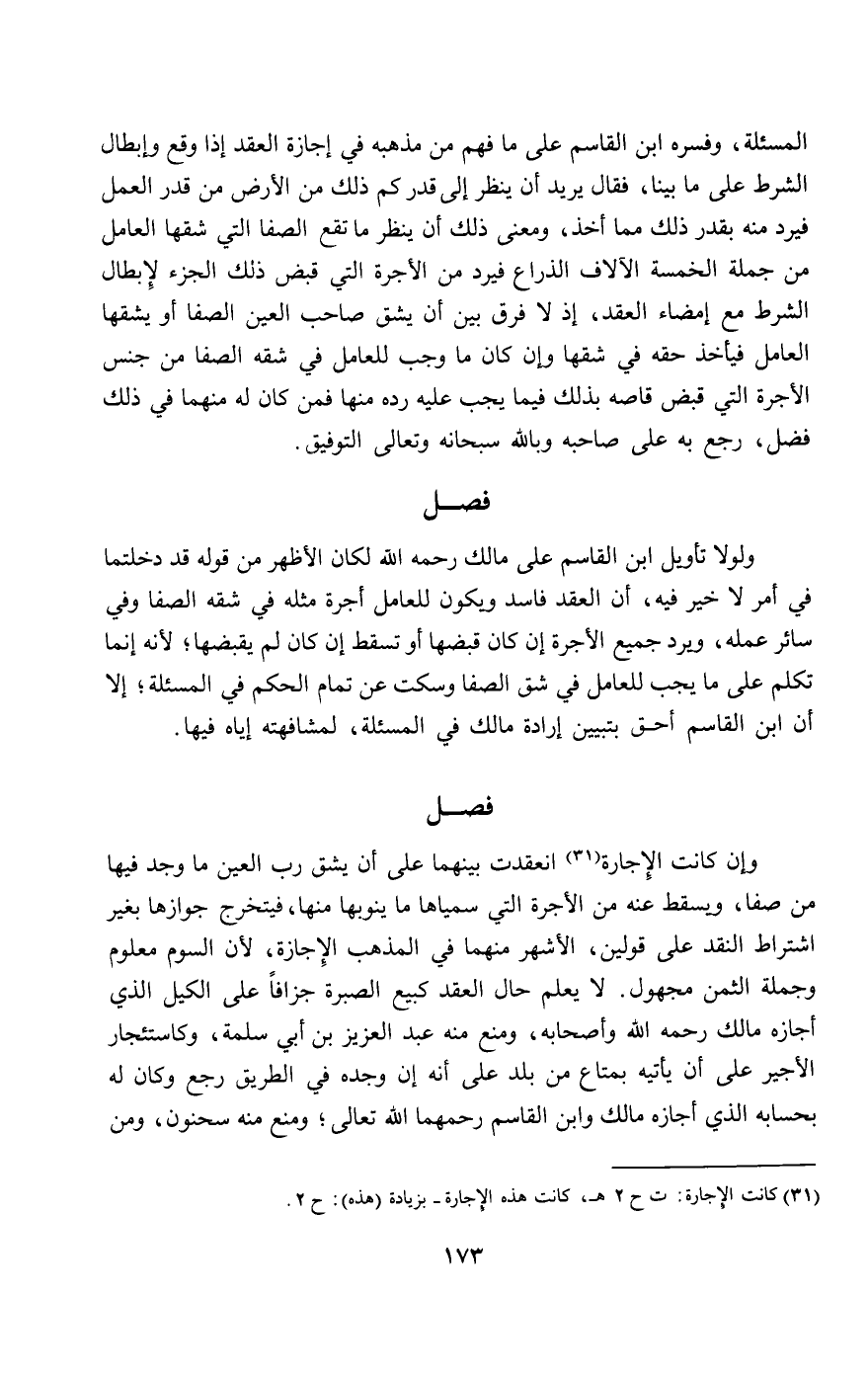 المسألة، وفسره ابن القاسم على ما فهم من مذهبه في إجازة العقد إذا وقع وإبطال الشرط على ما بينا، فقال: يريد أن ينظر إلى قدر كم ذلك من الأرض من قدر العمل فيرد منه بقدر ذلك مما أخذ، ومعنى ذلك أن ينظر ما تقع الصفا التي شقها العامل من جملة الخمسة الآلاف الذراع فيرد من الأجرة التي قبض ذلك الجزء لإبطال الشرط مع إمضاء العقد، إذ لا فرق بين أن يشق صاحب العين الصفا أو يشقها العامل فيأخذ حقه في شقها، وإن كان ما وجب للعامل في شقه الصفا من جنس الأجرة التي قبض قاصه بذلك فيما يجب عليه رده منها، فمن كان له منهما في ذلك فضل، رجع به على صاحبه وبالله سبحانه وتعالى التوفيق.