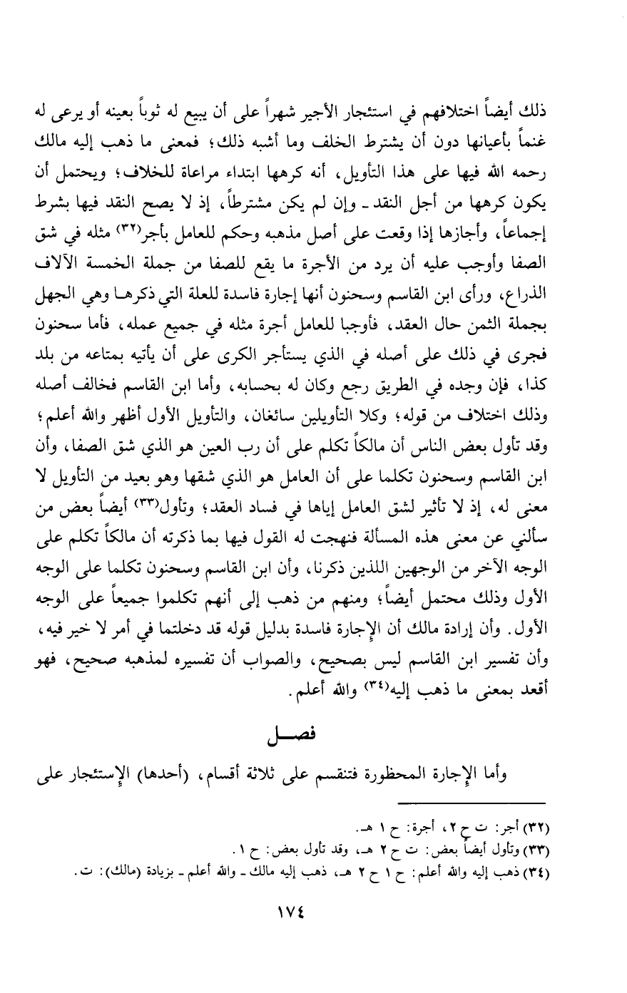 ذلك أيضا اختلافهم في استئجار الأجير شهرا على أن يبيع له ثوبا بعينه أو يرعى له غنما بأعيانها دون أن يشترط الخلف وما أشبه ذلك؛ فمعنى ما ذهب إليه مالك - رَحِمَهُ اللَّهُ - فيها على هذا التأويل، أنه كرهها ابتداء مراعاة للخلاف؛ ويحتمل أن يكون كرهها من أجل النقد - وإن لم يكن مشترطا؛ إذ لا يصح النقد فيها بشرط إجماعا، وأجازها إذا وقعت على أصل مذهبه وحكم للعامل بأجر مثله في شق الصفا وأوجب عليه أن يرد من الأجرة ما يقع للصفا من جملة الخمسة الآلاف الذراع، ورأى ابن القاسم وسحنون أنها إجارة فاسدة للعلة التي ذكرها وهي الجهل بجملة الثمن حال العقد، فأوجبا للعامل أجرة مثله في جميع عمله، فأما سحنون فجرى في ذلك على أصله في الذي يستأجر الكرى على أن يأتيه بمتاعه من بلد كذا، فإن وجده في الطريق رجع وكان له بحسابه، وأما ابن القاسم فخالف أصله وذلك اختلاف من قوله؛ وكلا التأويلين سائغان، والتأويل الأول أظهر والله أعلم.