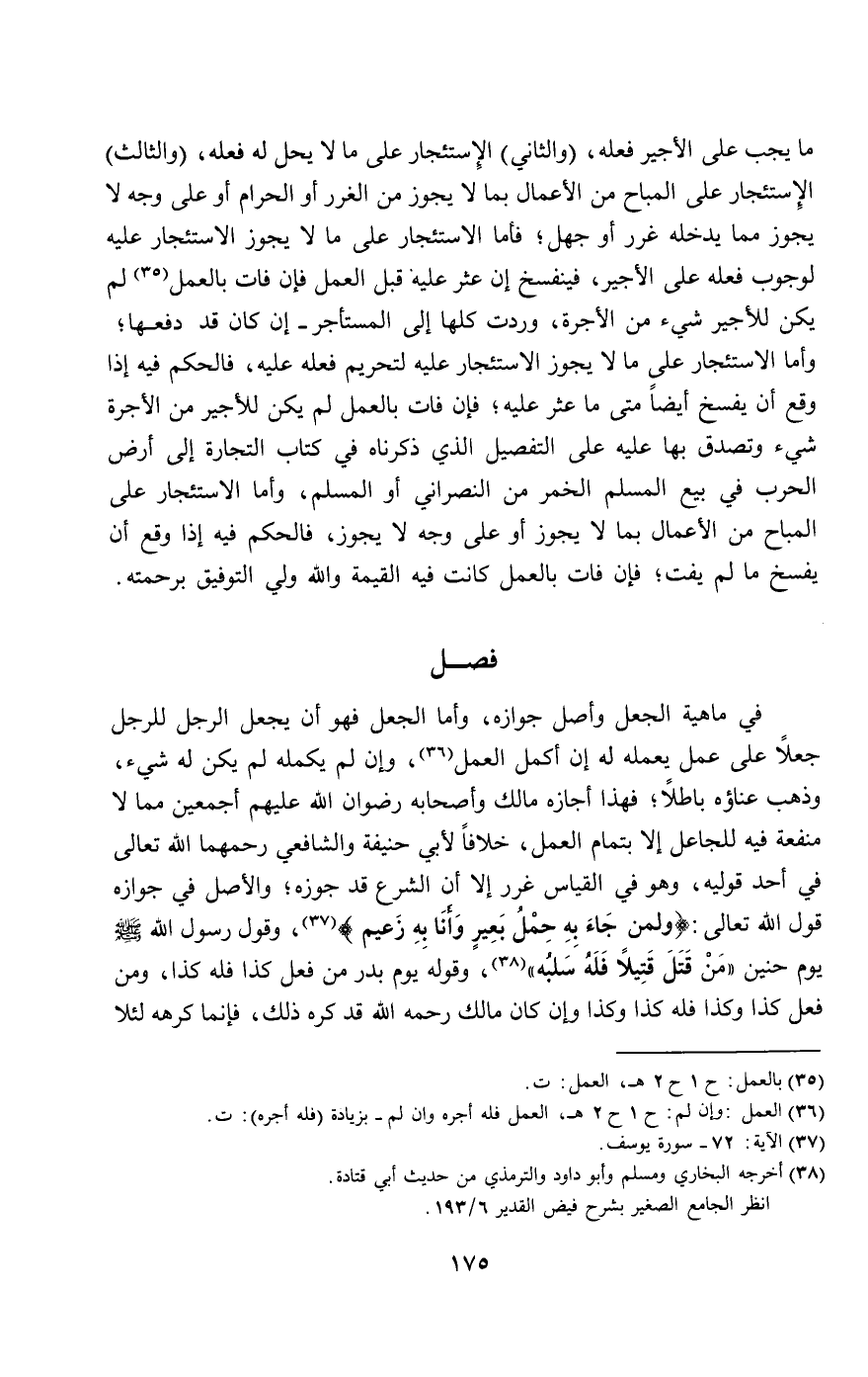 وأما الجعل فهو أن يجعل الرجل للرجل جعلا على عمل يعمله له إن أكمل العمل، وإن لم يكمله لم يكن له شيء، وذهب عناؤه باطلا؛ فهذا أجازه مالك وأصحابه - رِضْوَانُ اللَّهِ عَلَيْهِمْ أَجْمَعِينَ - مما لا منفعة فيه للجاعل إلا بتمام العمل، خلافا لأبي حنيفة والشافعي رحمهما الله تعالى في أحد قوليه، وهو في القياس غرر إلا أن الشرع قد جوزه؛ والأصل في جوازه قول الله تعالى: {وَلِمَنْ جَاءَ بِهِ حِمْلُ بَعِيرٍ وَأَنَا بِهِ زَعِيمٌ} [يوسف: 72]، وقول رسول الله - صَلَّى اللَّهُ عَلَيْهِ وَسَلَّمَ - يوم حنين: " من قتل قتيلا فله سلبه "، وقوله يوم بدر: " من فعل كذا فله كذا، ومن فعل كذا وكذا فله كذا وكذا "، وإن كان مالك - رَحِمَهُ اللَّهُ - قد كره ذلك، فإنما كرهه لئلا