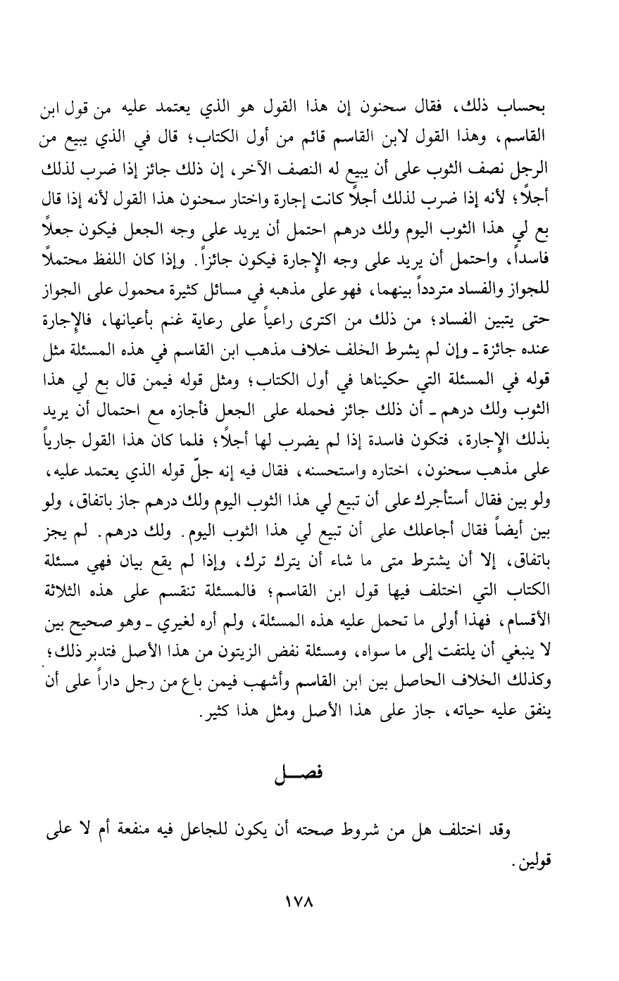 بحساب ذلك، فقال سحنون: إن هذا القول هو الذي يعتمد عليه من قول ابن القاسم، وهذا القول لابن القاسم قائم من أول الكتاب؛ قال في الذي يبيع من الرجل نصف الثوب على أن يبيع له النصف الآخر، إن ذلك جائز إذا ضرب لذلك أجلا؛ لأنه إذا ضرب لذلك أجلا كانت إجارة واختار سحنون هذا القول؛ لأنه إذا قال: بع لي هذا الثوب اليوم ولك درهم، احتمل أن يريد على وجه الجعل فيكون جعلا فاسدا، واحتمل أن يريد على وجه الإجارة فيكون جائزا. وإذا كان اللفظ محتملا للجواز والفساد مترددا بينهما، فهو على مذهبه في مسائل كثيرة محمول على الجواز حتى يتبين الفساد، من ذلك من اكترى راعيا على رعاية غنم بأعيانها، فالإجارة عنده جائزة - وإن لم يشرط الخلف خلاف مذهب ابن القاسم في هذه المسألة مثل قوله في المسألة التي حكيناها في أول الكتاب؛ ومثل قوله فيمن قال: بع لي هذا الثوب ولك درهم - أن ذلك جائز فحمله على الجعل فأجازه مع احتمال أن يريد بذلك الإجارة، فتكون فاسدة إذا لم يضرب لها أجلا؛ فلما كان هذا القول جاريا على مذهب سحنون، اختاره واستحسنه، فقال فيه: إنه جل قوله الذي يعتمد عليه، ولو بين فقال: أستأجرك على أن تبيع لي هذا الثوب اليوم ولك درهم جاز باتفاق، ولو بين أيضا فقال: أجاعلك على أن تبيع لي هذا الثوب اليوم. ولك درهم. لم يجز باتفاق، إلا أن يشترط متى ما شاء أن يترك ترك، وإذا لم يقع بيان فهي مسألة الكتاب التي اختلف فيها قول ابن القاسم؛ فالمسألة تنقسم على هذه الثلاثة الأقسام، فهذا أولى ما تحمل عليه هذه المسألة، ولم أره لغيري - وهو صحيح بين لا ينبغي أن يلتفت إلى ما سواه، ومسألة نفض الزيتون من هذا الأصل فتدبر ذلك، وكذلك الخلاف الحاصل بين ابن القاسم وأشهب فيمن باع من رجل دارا على أن ينفق عليه حياته، جاز على هذا الأصل ومثل هذا كثير.