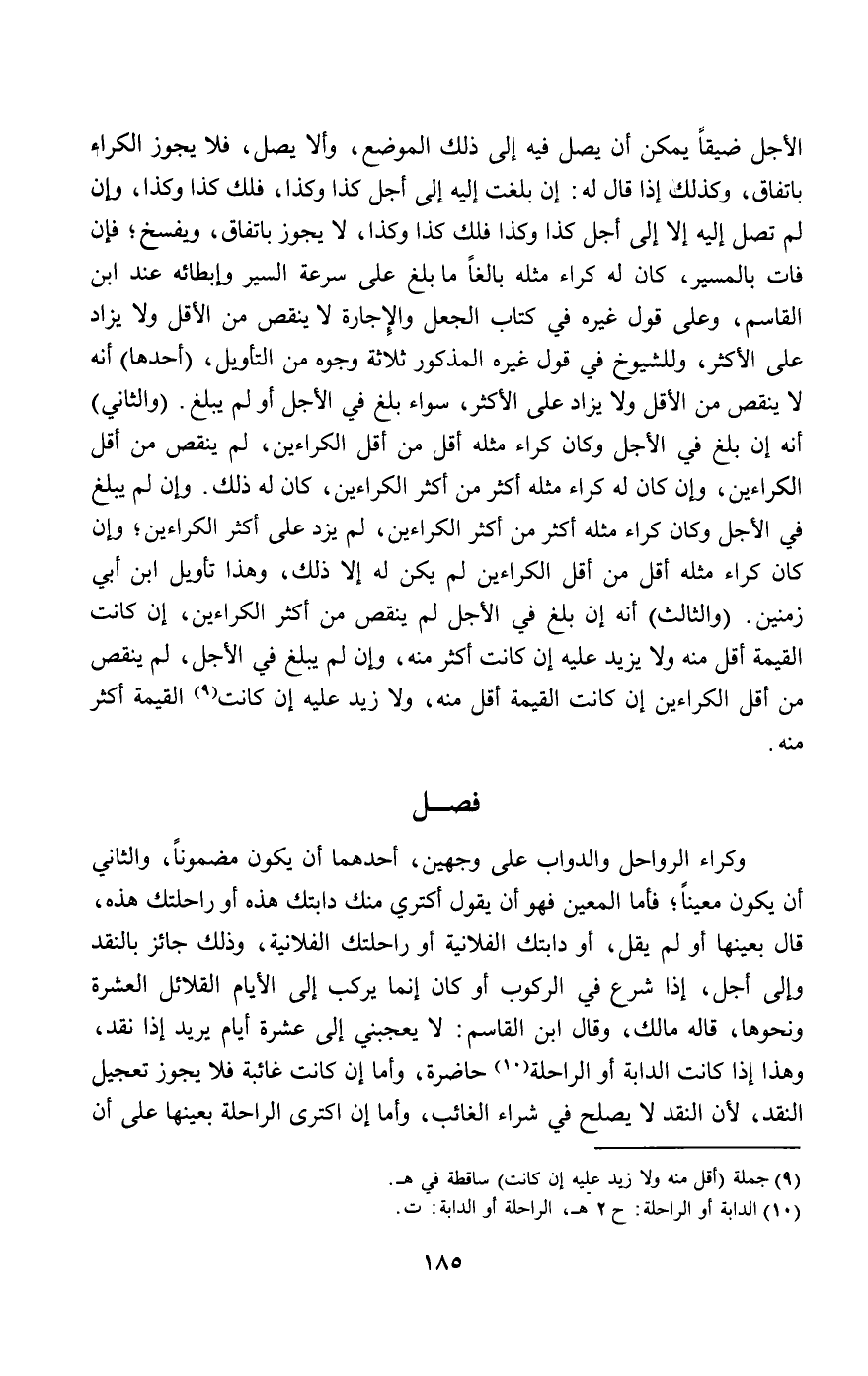 وكراء الرواحل والدواب على وجهين، أحدهما: أن يكون مضمونا، والثاني: أن يكون معينا؛ فأما المعين فهو أن يقول: أكتري منك دابتك هذه أو راحلتك هذه، قال بعينها أو لم يقل، أو دابتك الفلانية أو راحلتك الفلانية، وذلك جائز بالنقد وإلى أجل، إذا شرع في الركوب أو كان إنما يركب إلى الأيام القلائل العشرة ونحوها، قاله مالك، وقال ابن القاسم: لا يعجبني إلى عشرة أيام يريد إذا نقد، وهذا إذا كانت الدابة أو الراحلة حاضرة، وأما إن كانت غائبة فلا يجوز تعجيل النقد؛ لأن النقد لا يصلح في شراء الغائب، وأما إن اكترى الراحلة بعينها على أن