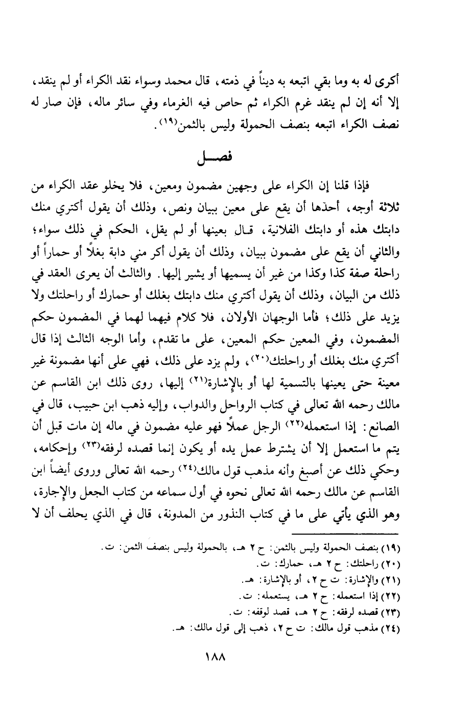 فإذا قلنا: إن الكراء على وجهين: مضمون ومعين، فلا يخلو عقد الكراء من ثلاثة أوجه، أحدها: أن يقع على معين ببيان ونص، وذلك أن يقول: أكتري منك دابتك هذه أو دابتك الفلانية، قال: بعينها أو لم يقل، الحكم في ذلك سواء؛ والثاني: أن يقع على مضمون ببيان، وذلك أن يقول: أكر مني دابة بغلا أو حمارا أو راحلة صفة كذا وكذا من غير أن يسميها أو يشير إليها. والثالث: أن يعرى العقد في ذلك من البيان، وذلك أن يقول: أكتري منك دابتك بغلك أو حمارك أو راحلتك ولا يزيد على ذلك؛ فأما الوجهان الأولان، فلا كلام فيهما لهما في المضمون حكم المضمون، وفي المعين حكم المعين، على ما تقدم، وأما الوجه الثالث: إذا قال: أكتري منك بغلك أو راحلتك، ولم يزد على ذلك، فهي على أنها مضمونة غير معينة حتى يعينها بالتسمية لها أو بالإشارة إليها، روى ذلك ابن القاسم عن مالك - رَحِمَهُ اللَّهُ تَعَالَى - في كتاب الرواحل والدواب، وإليه ذهب ابن حبيب، قال في الصانع: إذا استعمله الرجل عملا فهو عليه مضمون في ماله إن مات قبل أن يتم ما استعمل إلا أن يشترط عمل يده أو يكون إنما قصده لرفقه وإحكامه، وحكي ذلك عن أصبغ وأنه مذهب قول مالك - رَحِمَهُ اللَّهُ تَعَالَى - وروى أيضا ابن القاسم عن مالك - رَحِمَهُ اللَّهُ تَعَالَى - نحوه في أول سماعه من كتاب الجعل والإجارة، وهو الذي يأتي على ما في كتاب النذور من المدونة، قال في الذي يحلف أن لا