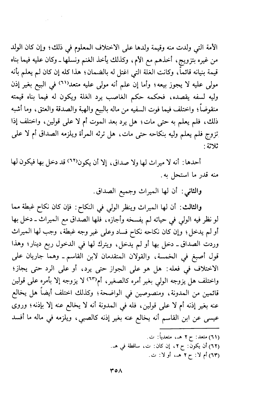 الأمة التي ولدت منه وقيمة ولدها على الاختلاف المعلوم في ذلك؛ وإن كان الولد من غيره بتزويج، أخذهم مع الأم، وكذلك يأخذ الغنم ونسلها- وكان عليه فيما بناه قيمة بنيانه قائما، وكانت الغلة التي اغتل له بالضمان؛ هذا كله إن كان لم يعلم بأنه مولى عليه لا يجوز بيعه؛ وأما إن علم أنه مولى عليه متعد في البيع بغير إذن وليه لسفه يقصده، فحكمه حكم الغاصب يرد الغلة ويكون له فيما بناه قيمته منقوضا؛ واختلف فيما فوت السفيه من ماله بالبيع والهبة والصدقة والعتق، وما أشبه ذلك، فلم يعلم به حتى مات؛ هل يرد بعد الموت أم لا على قولين، واختلف إذا تزوج فلم يعلم وليه بنكاحه حتى مات، هل ترثه المرأة ويلزمه الصداق أم لا على ثلاثة: