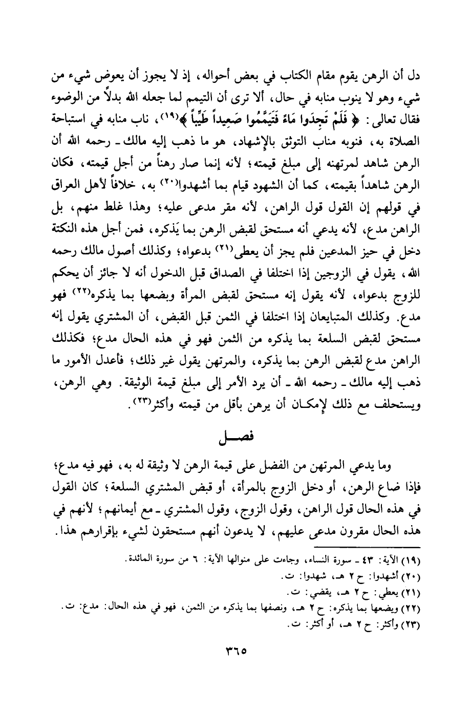 دل أن الرهن يقوم مقام الكتاب في بعض أحواله، إذ لا يجوز أن يعوض شيء من شيء وهو لا ينوب منابه في حال، ألا ترى أن التيمم لما جعله الله بدلا من الوضوء فقال تعالى: {فَلَمْ تَجِدُوا مَاءً فَتَيَمَّمُوا صَعِيدًا طَيِّبًا} [النساء: 43]، ناب منابه في استباحة الصلاة به، فنوبه مناب التوثق بالإشهاد، هو ما ذهب إليه مالك - رَحِمَهُ اللَّهُ - أن الرهن شاهد لمرتهنه إلى مبلغ قيمته؛ لأنه إنما صار رهنا من أجل قيمته، فكان الرهن شاهدا بقيمته، كما أن الشهود قيام بما أشهدوا به، خلافا لأهل العراق - في قولهم إن القول قول الراهن؛ لأنه مقر مدعى عليه؛ وهذا غلط منهم، بل الراهن مدع؛ لأنه يدعي أنه مستحق لقبض الرهن بما يذكره، فمن أجل هذه النكتة دخل في حيز المدعين فلم يجز أن يعطى بدعواه.