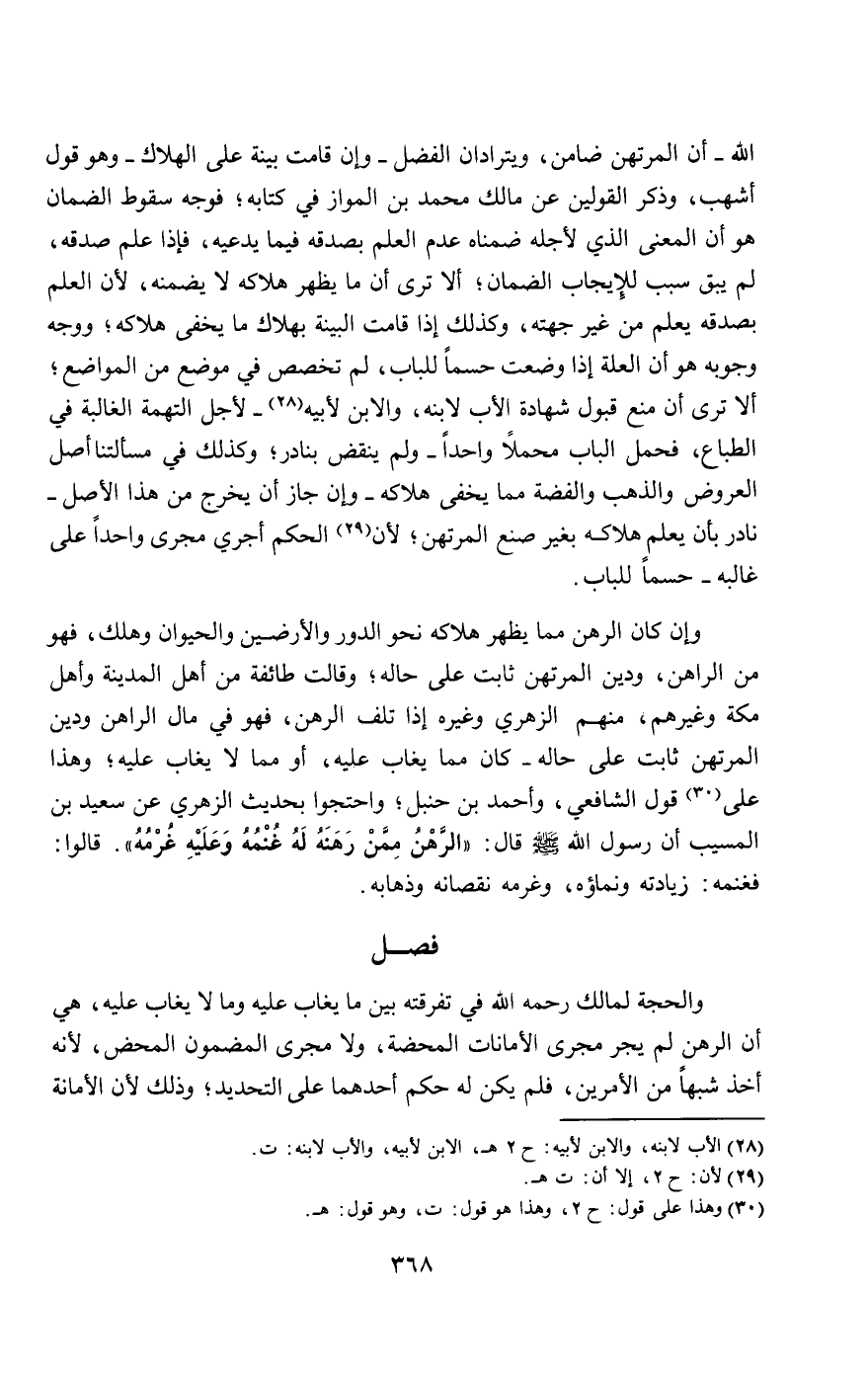 الله- أن المرتهن ضامن، ويترادان الفضل- وإن قامت بينة على الهلاك- وهو قول أشهب، وذكر القولين عن مالك محمد بن المواز في كتابه، فوجه سقوط الضمان هو أن المعنى الذي لأجله ضمناه عدم العلم بصدقه فيما يدعيه، فإذا علم صدقه، لم يبق سبب لإيجاب الضمان، ألا ترى أن ما يظهر هلاكه لا يضمنه؛ لأن العلم بصدقه يعلم من غير جهته، وكذلك إذا قامت البينة بهلاك ما يخفى هلاكه؛ ووجه وجوبه هو أن العلة إذا وضعت حسما للباب، لم تخصص في موضع من المواضع؛ ألا ترى أن منع قبول شهادة الأب لابنه، والابن لأبيه - لأجل التهمة الغالبة في الطباع، فحمل الباب محملا واحدا- ولم ينقض بنادر؛ وكذلك في مسألتنا أصل العروض والذهب والفضة مما يخفى هلاكه- وإن جاز أن يخرج من هذا الأصل- نادر بأن يعلم هلاكه بغير صنع المرتهن؛ لأن الحكم أجري مجرى واحدا على غالبه- حسما للباب.