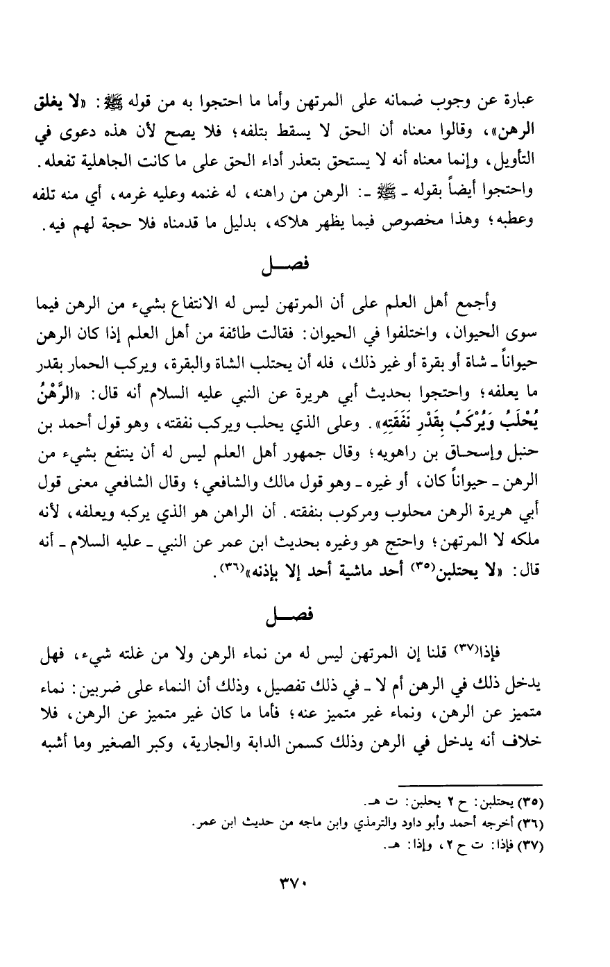 وأجمع أهل العلم على أن المرتهن ليس له الانتفاع بشيء من الرهن فيما سوى الحيوان، واختلفوا في الحيوان: فقالت طائفة من أهل العلم إذا كان الرهن حيوانا- شاة أو بقرة أو غير ذلك، فله أن يحتلب الشاة والبقرة، ويركب الحمار بقدر ما يعلفه؛ واحتجوا بحديث أبي هريرة عن النبي - عَلَيْهِ السَّلَامُ - أنه قال: «الرهن يحلب ويركب بقدر نفقته ". وعلى الذي يحلب ويركب نفقته» وهو قول أحمد بن حنبل وإسحاق بن راهويه؛ وقال جمهور أهل العلم ليس له أن ينتفع بشيء من الرهن- حيوانا كان، أو غيره- وهو قول مالك والشافعي، وقال الشافعي معنى قول أبي هريرة الرهن محلوب ومركوب بنفقته. أن الراهن هو الذي يركبه ويعلفه؛ لأنه ملكه لا المرتهن؛ واحتج هو وغيره بحديث ابن عمر عن النبي- عَلَيْهِ السَّلَامُ - أنه قال: «لا يحتلبن أحد ماشية أحد إلا بإذنه».