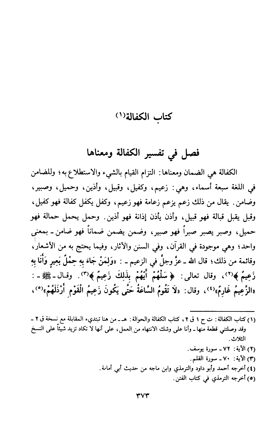 الكفالة هي الضمان ومعناها: التزام القيام بالشيء والاستطلاع به؛ وللضامن في اللغة سبعة أسماء، وهي: زعيم، وكفيل، وقبيل، وأذين، وحميل، وصبير، وضامن. يقال من ذلك زعم يزعم زعامة فهو زعيم، وكفل يكفل كفالة فهو كفيل، وقبل يقبل قبالة فهو قبيل، وأذن يأذن إذانة فهو أذين. وحمل يحمل حمالة فهو حميل، وصبر يصبر صبرا فهو صبير، وضمن يضمن ضمانا فهو ضامن- بمعنى واحد وهي موجودة في القرآن، وفي السنن والآثار، وفيما يحتج به من الأشعار، وقائمة من ذلك؛ قال الله- عز وجل في الزعيم-: {وَلِمَنْ جَاءَ بِهِ حِمْلُ بَعِيرٍ وَأَنَا بِهِ زَعِيمٌ} [يوسف: 72]، وقال تعالى: {سَلْهُمْ أَيُّهُمْ بِذَلِكَ زَعِيمٌ} [القلم: 40]. وقال- صَلَّى اللَّهُ عَلَيْهِ وَسَلَّمَ -: «الزعيم غارم»، وقال: «لا تقوم الساعة حتى يكون زعيم القوم أرذلهم»،
