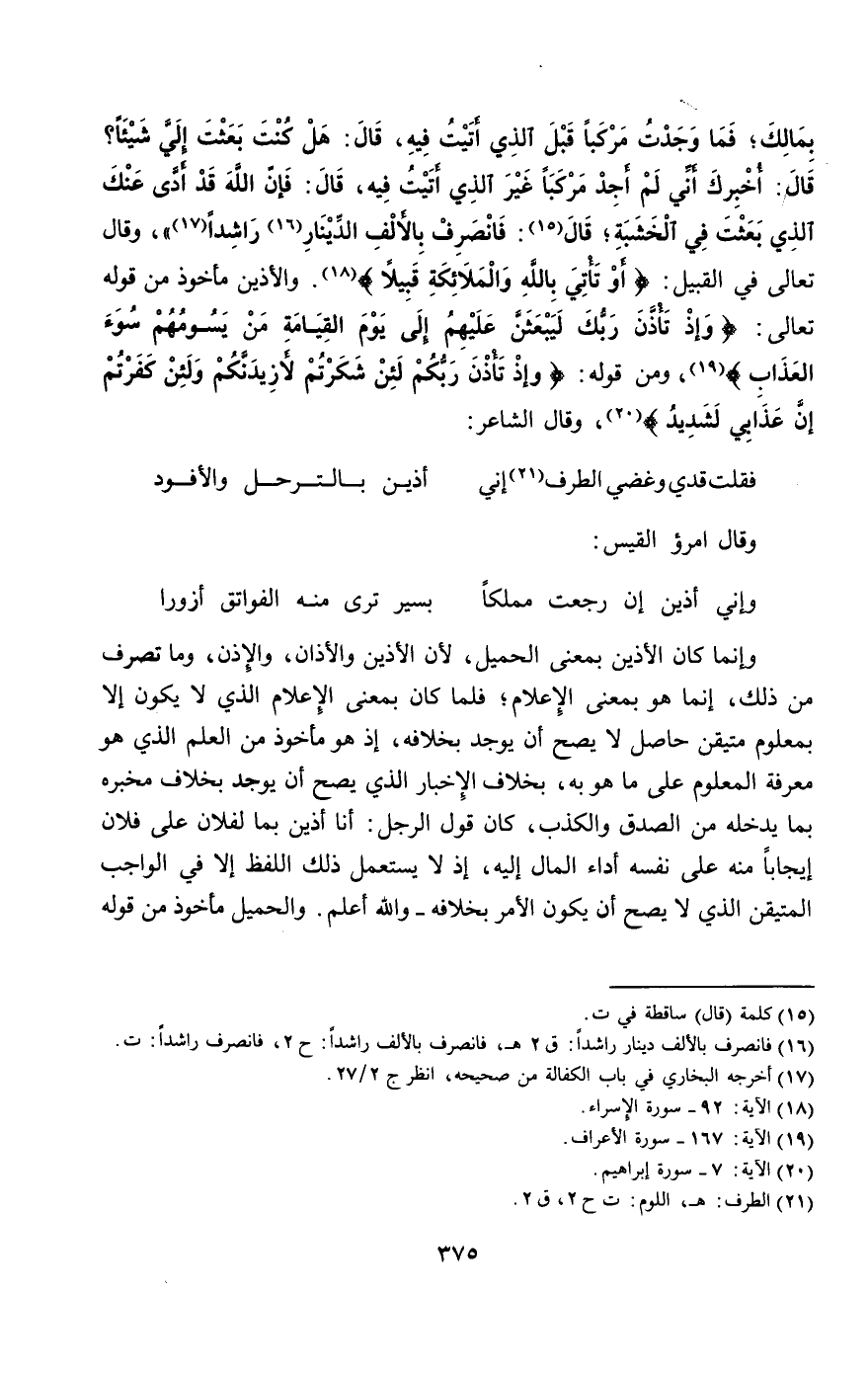 بمالك، فما وجدت مركبا قبل الذي أتيت فيه، قال: هل كنت بعثت إلى شيئا؛ قال: أخبرك أني لم أجد مركبا غير الذي أتيت فيه، قال: فإن الله قد أدى عنك الذي بعثت في الخشبة؛ قال: فانصرف بالألف الدينار راشدا» وقال تعالى في القبيل: {أَوْ تَأْتِيَ بِاللَّهِ وَالْمَلائِكَةِ قَبِيلا} [الإسراء: 92]. والأذين مأخوذ من قَوْله تَعَالَى: {وَإِذْ تَأَذَّنَ رَبُّكَ لَيَبْعَثَنَّ عَلَيْهِمْ إِلَى يَوْمِ الْقِيَامَةِ مَنْ يَسُومُهُمْ سُوءَ الْعَذَابِ} [الأعراف: 167]، ومن قوله: {وَإِذْ تَأَذَّنَ رَبُّكُمْ لَئِنْ شَكَرْتُمْ لأَزِيدَنَّكُمْ وَلَئِنْ كَفَرْتُمْ إِنَّ عَذَابِي لَشَدِيدٌ} [إبراهيم: 7]، وقال الشاعر:
