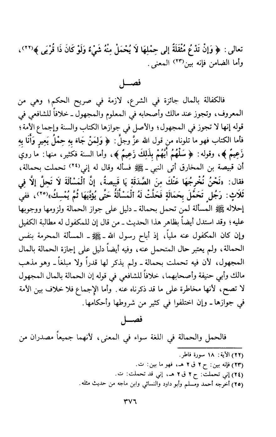 فالكفالة بالمال جائزة في الشرع، لازمة في صريح الحكم؛ وهي من المعروف، وتجوز عند مالك وأصحابه في المعلوم والمجهول- خلافا للشافعي في قوله: إنها لا تجوز في المجهول؛ والأصل في جوازها الكتاب والسنة وإجماع الأمة؛ فأما الكتاب فهو ما تلوناه من قول الله عز وجل: {وَلِمَنْ جَاءَ بِهِ حِمْلُ بَعِيرٍ وَأَنَا بِهِ زَعِيمٌ} [يوسف: 72]، وقوله: {سَلْهُمْ أَيُّهُمْ بِذَلِكَ زَعِيمٌ} [القلم: 40]، وأما السنة فكثير، منها: ما روي «أن قبيصة بن المخارق أتى النبي- صَلَّى اللَّهُ عَلَيْهِ وَسَلَّمَ - فسأله وقال له إني تحملت بحمالة، فقال: " نحن نخرجها عنك من الصدقة يا قبيصة، إن المسألة لا تحل إلا في ثلاث: رجل تحمل بحمالة فحلت له المسألة حتى يؤديها ثم يمسك»، ففي إحلاله - صَلَّى اللَّهُ عَلَيْهِ وَسَلَّمَ - المسألة لمن تحمل بحمالة- دليل على جواز الحمالة ولزومها ووجوبها عليه؛ وقد استدل أيضا بظاهر هذا الحديث- من قال إن للمكفول له مطالبة الكفيل وإن كان المكفول عنه مليا، إذ أباح رسول الله- صَلَّى اللَّهُ عَلَيْهِ وَسَلَّمَ - المسألة المحرمة بنفس الحمالة، ولم يعتبر حال المتحمل عنه، وفيه أيضا دليل على إجازة الحمالة بالمال المجهول؛ لأن فيه تحملت بحمالة- ولم يذكر لها قدرا ولا مبلغا- وهو مذهب مالك وأبي حنيفة وأصحابهما، خلافا للشافعي في قوله: إن الحمالة بالمال المجهول لا تصح، لأنها مخاطرة على ما قد ذكرناه عنه. وأما الإجماع فلا خلاف بين الأمة في جوازها- وإن اختلفوا في كثير من شروطها وأحكامها.