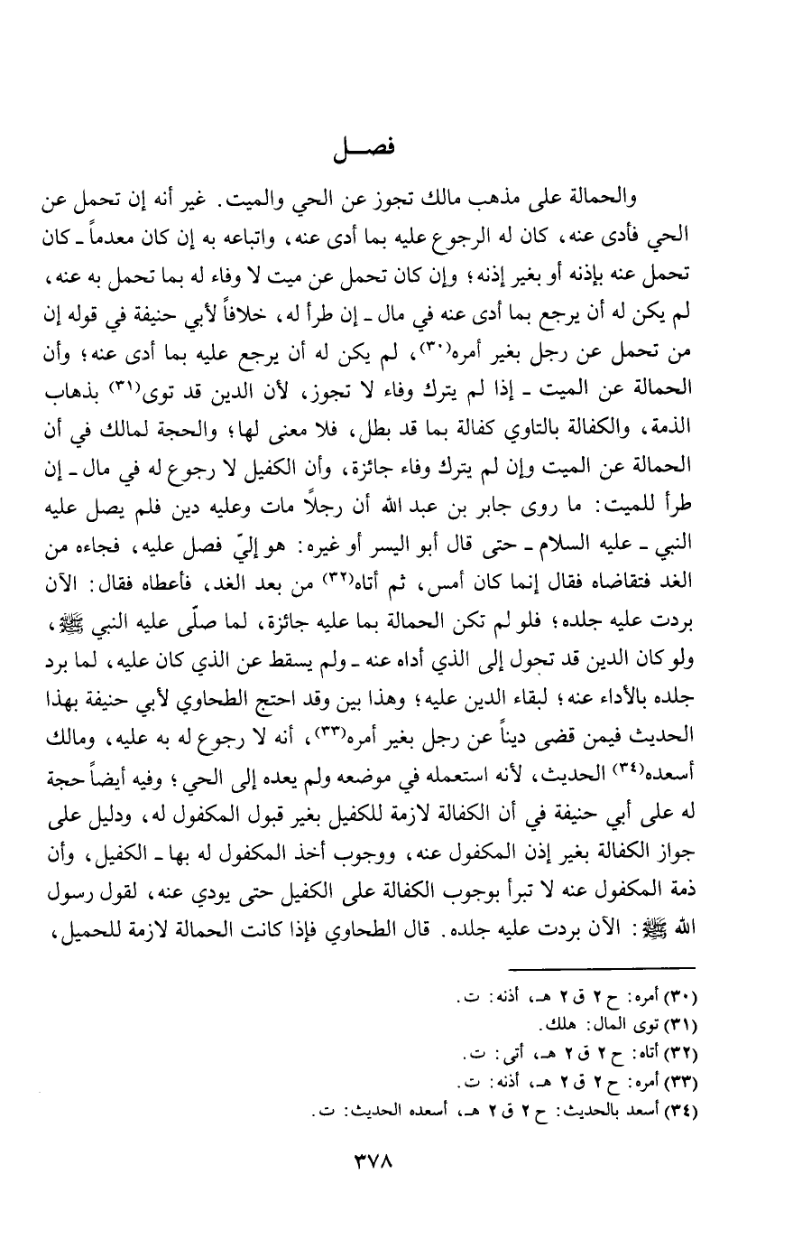والحمالة على مذهب مالك تجوز عن الحي والميت. غير أنه إن تحمل عن الحي فأدى عنه، كان له الرجوع عليه بما أدى عنه، واتباعه به إن كان معدما- كان تحمل عنه بإذنه أو بغير إذنه؛ وإن كان تحمل عن ميت لا وفاء له بما تحمل به عنه، لم يكن له أن يرجع بما أدى عنه في مال- إن طرأ له، خلافا لأبي حنيفة في قوله: إن من تحمل عن رجل بغير أمره، لم يكن له أن يرجع عليه بما أدى عنه، وأن الحمالة عن الميت- إذا لم يترك وفاء لا تجوز؛ لأن الدين قد توى بذهاب الذمة، والكفالة بالتاوي كفالة بما قد بطل، فلا معنى لها، والحجة لمالك في أن الحمالة عن الميت وإن لم يترك وفاء جائزة، وأن الكفيل لا رجوع له في مال- إن طرأ للميت: ما «روى جابر بن عبد الله أن رجلا مات وعليه دين فلم يصل عليه النبي- عَلَيْهِ السَّلَامُ - حتى قال أبو اليسر أو غيره: هو إلي فصل عليه، فجاءه من الغد فتقاضاه فقال: إنما كان أمس، ثم أتاه من بعد الغد، فأعطاه فقال: الآن بردت عليه جلده».