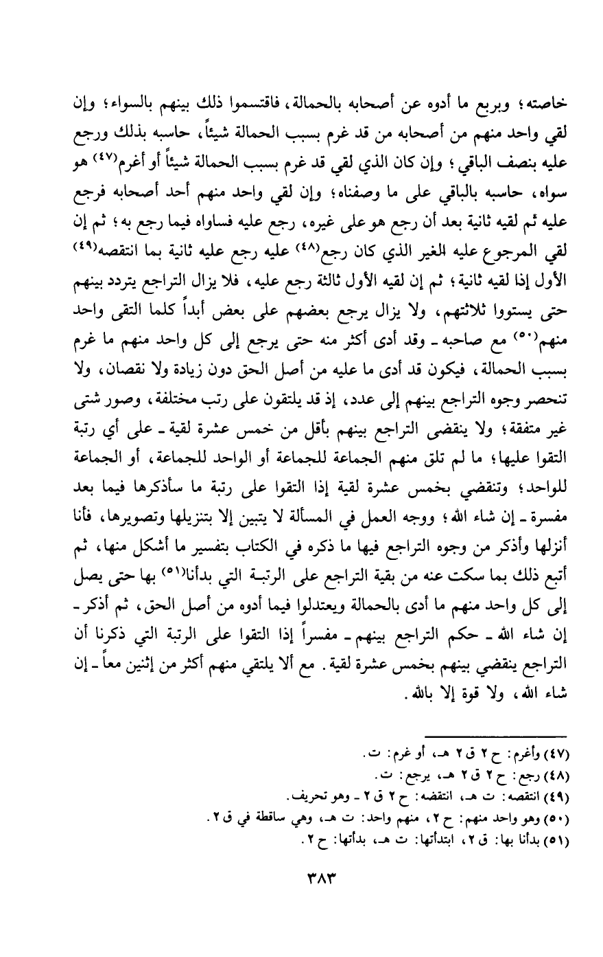 خاصته، وبربع ما أدوه عن أصحابه بالحمالة، فاقتسموا ذلك بينهم بالسواء؛ وإن لقي واحد منهم من أصحابه من قد غرم بسبب الحمالة شيئا، حاسبه بذلك ورجع عليه بنصف الباقي؛ وإن كان الذي لقي قد غرم بسبب الحمالة شيئا أو أغرم هو سواه، حاسبه بالباقي على ما وصفناه؛ وإن لقي واحد منهم أحد أصحابه فرجع عليه، ثم لقيه ثانية بعد أن رجع هو على غيره، رجع عليه فساواه فيما رجع به؛ ثم إن لقي المرجوع عليه الغير الذي كان رجع عليه رجع عليه ثانية بما انتقصه الأول إذا لقيه ثانية، ثم إن لقيه الأول ثالثة رجع عليه، فلا يزال التراجع يتردد بينهم حتى يستووا ثلاثتهم، ولا يزال يرجع بعضهم على بعض أبدا كلما التقى واحد منهم. مع صاحبه- وقد أدى أكثر منه حتى يرجع إلى كل واحد منهم ما غرم بسبب الحمالة، فيكون قد أدى ما عليه من أصل الحق دون زيادة ولا نقصان، ولا تنحصر وجوه التراجع بينهم إلى عدد، إذ قد يلتقون على رتب مختلفة، وصور شتى غير متفقة؛ ولا ينقضي التراجع بينهم بأقل من خمس عشرة لقية- على أي رتبة التقوا عليها؛ ما لم تلق منهم الجماعة للجماعة أو الواحد للجماعة، أو الجماعة للواحد؛ وتنقضي بخمس عشرة لقية إذا التقوا على رتبة ما سأذكرها فيما بعد مفسرة- إن شاء الله.