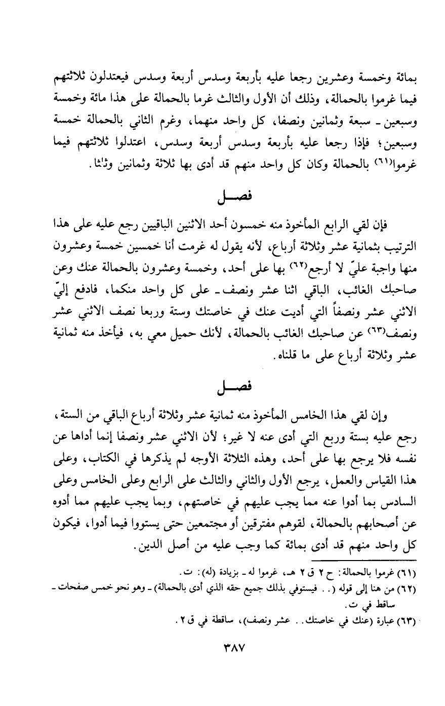 فإن لقي الرابع المأخوذ منه خمسون أحد الاثنين الباقيين رجع عليه على هذا الترتيب بثمانية عشر وثلاثة أرباع، لأنه يقول له غرمت أنا خمسين خمسة وعشرون منها واجبة علي لا أرجع بها على أحد، وخمسة وعشرون بالحمالة عنك وعن صاحبك الغائب، الباقي اثنا عشر ونصف - على كل واحد منكما، فادفع إلي الاثني عشر ونصفا التي أديت عنك في خاصتك وستة وربعا نصف الاثني عشر ونصف عن صاحبك الغائب بالحمالة، لأنك حميل معي به، فيأخذ منه ثمانية عشر وثلاثة أرباع على ما قلناه.