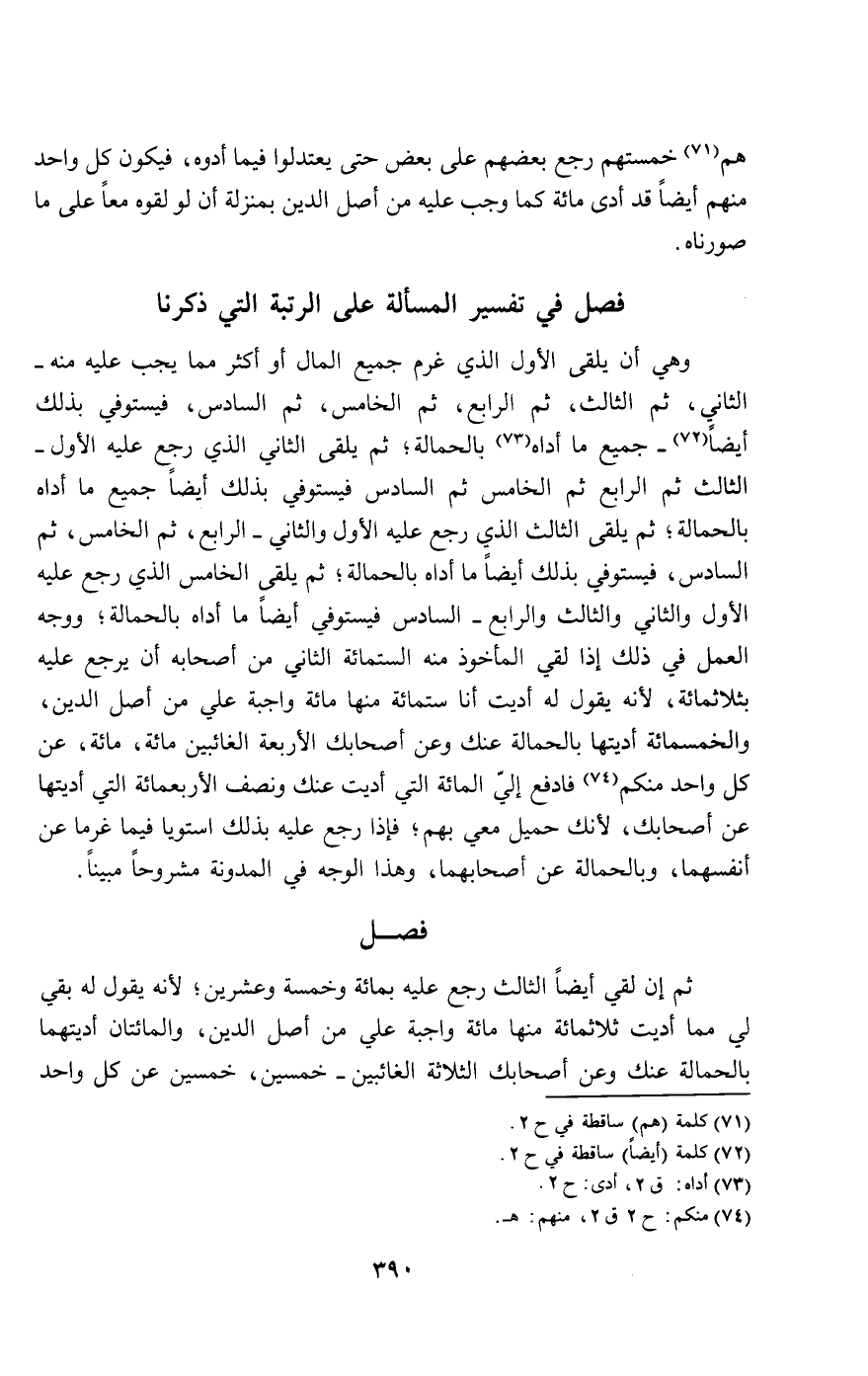ثم إن لقي أيضا الثالث رجع عليه بمائة وخمسة وعشرين، لأنه يقول له بقي لي مما أديت ثلاثمائة منها مائة واجبة علي من أصل الدين، والمائتان أديتهما بالحمالة عنك وعن أصحابك الثلاثة الغائبين - خمسين، خمسين عن كل واحد