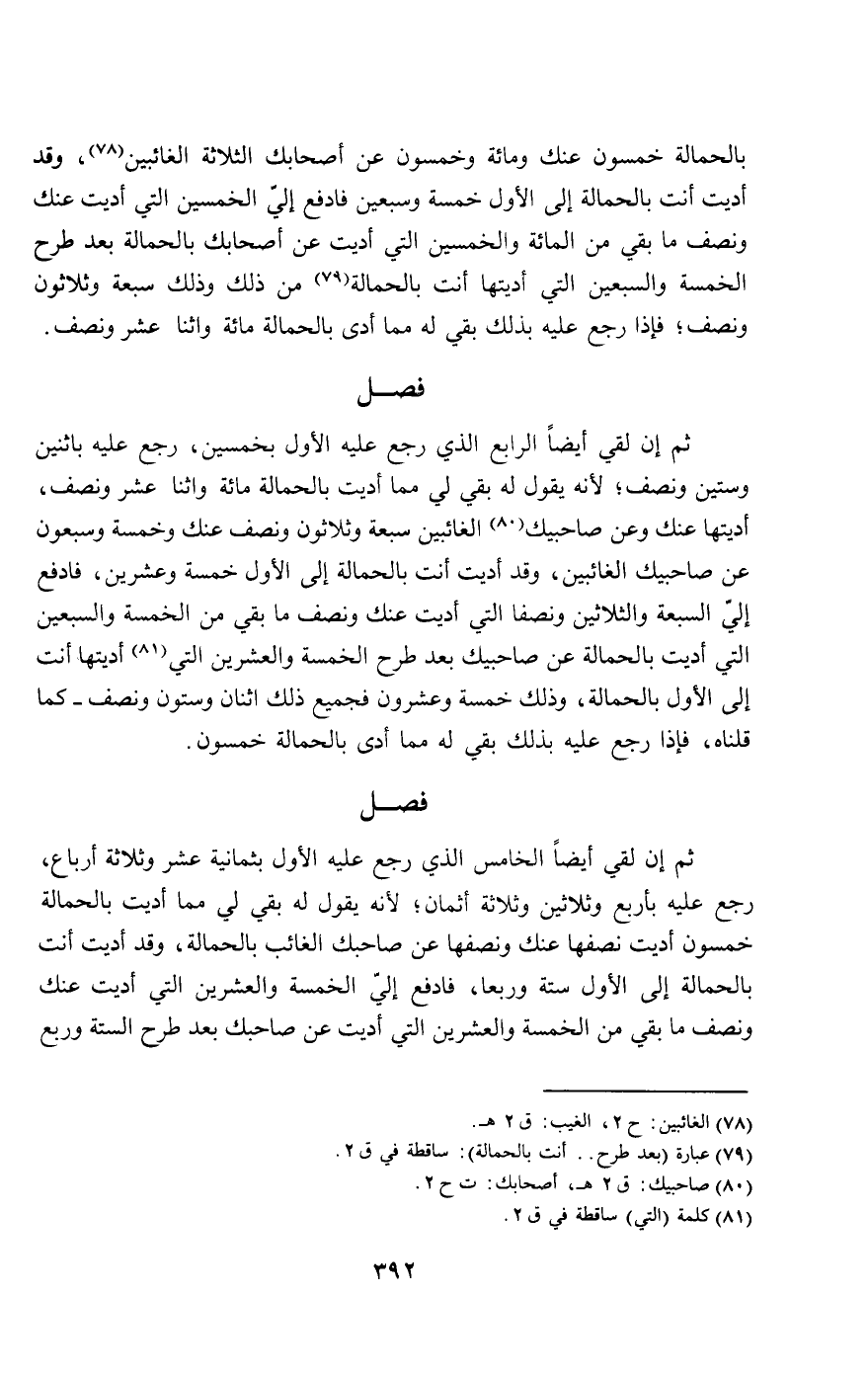 بالحمالة خمسون عنك ومائة وخمسون عن أصحابك الثلاثة الغائبين، وقد أديت أنت بالحمالة إلى الأول خمسة وسبعين فادفع إلي الخمسين التي أديت عنك ونصف ما بقي من المائة والخمسين التي أديت عن أصحابك بالحمالة بعد طرح الخمسة والسبعين التي أديتها أنت بالحمالة من ذلك وذلك سبعة وثلاثون ونصف؛ فإذا رجع عليه بذلك بقي له مما أدى بالحمالة مائة واثنا عشر ونصف.
