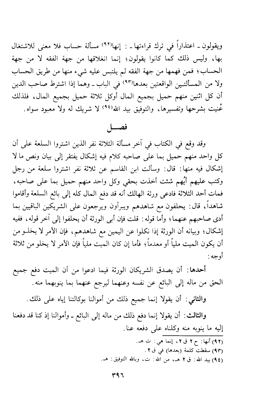 ويقولون - اعتذارا في ترك قراءتها -: إنها مسألة حساب فلا معنى للاشتغال بها، وليس ذلك كما كانوا يقولون، إنما انغلاقها من جهة الفقه لا من جهة الحساب، فمن فهمها من جهة الفقه لم يلتبس عليه شيء منها من طريق الحساب ولا من المسألتين الواقعتين بعدها في الباب - وهما إذا اشترط صاحب الدين أن كل اثنين منهم حميل بجميع المال أو كل ثلاثة حميل بجميع المال، فلذلك عنيت بشرحها وتفسيرها، والتوفيق بيد الله لا شريك له ولا معبود سواه.